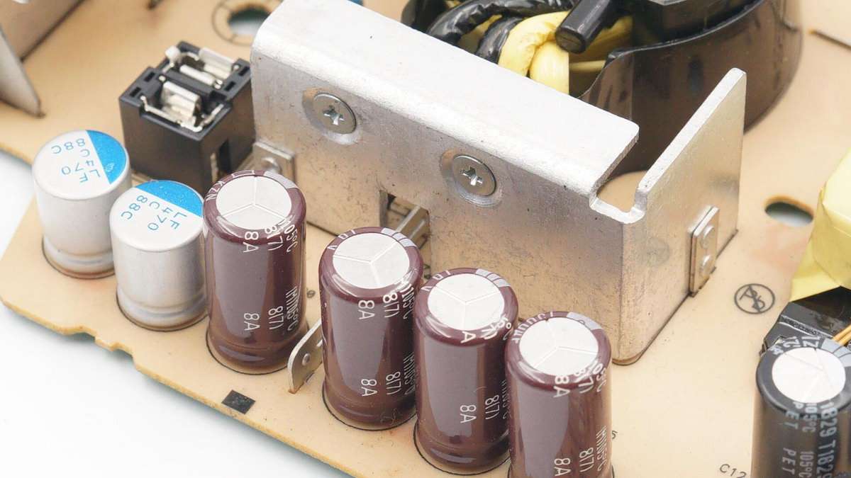散熱片旁是兩顆固態電容以及四顆電解電容,用于輸出濾波。