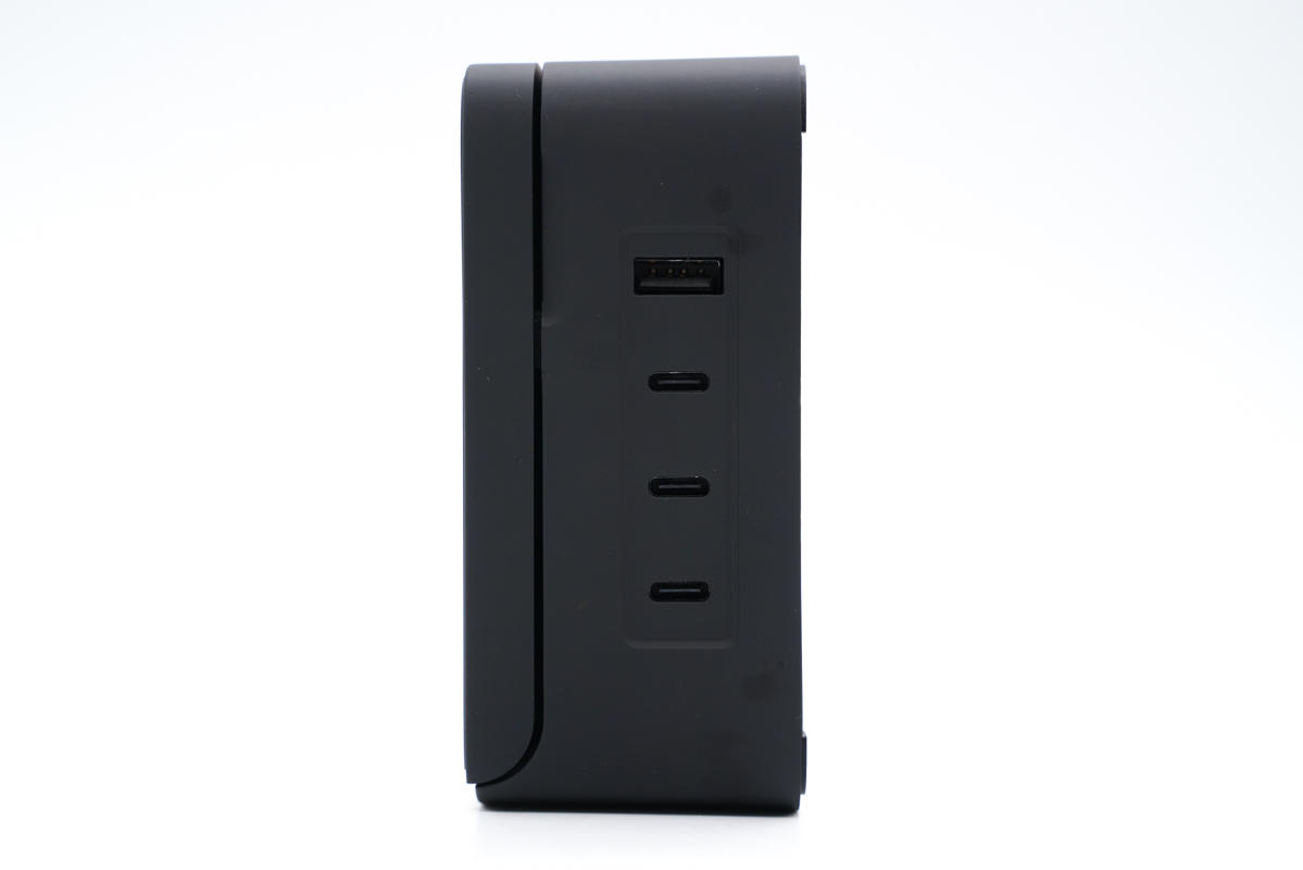 充電器底座一側(cè)設(shè)有3C1A四個USB接口,均采用黑色膠芯,渾然一體。