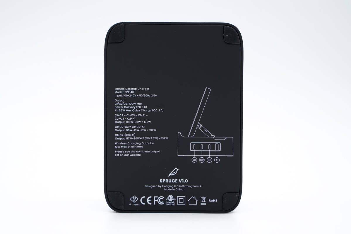 SPRUCE這款二合一產(chǎn)品不僅擁有10W輸出的無線充電板,還擁有一個強(qiáng)大充電器底座,配備3C1A四個USB接口,三個C口還都支持100W PD快充,可直接給筆記本電腦充電。