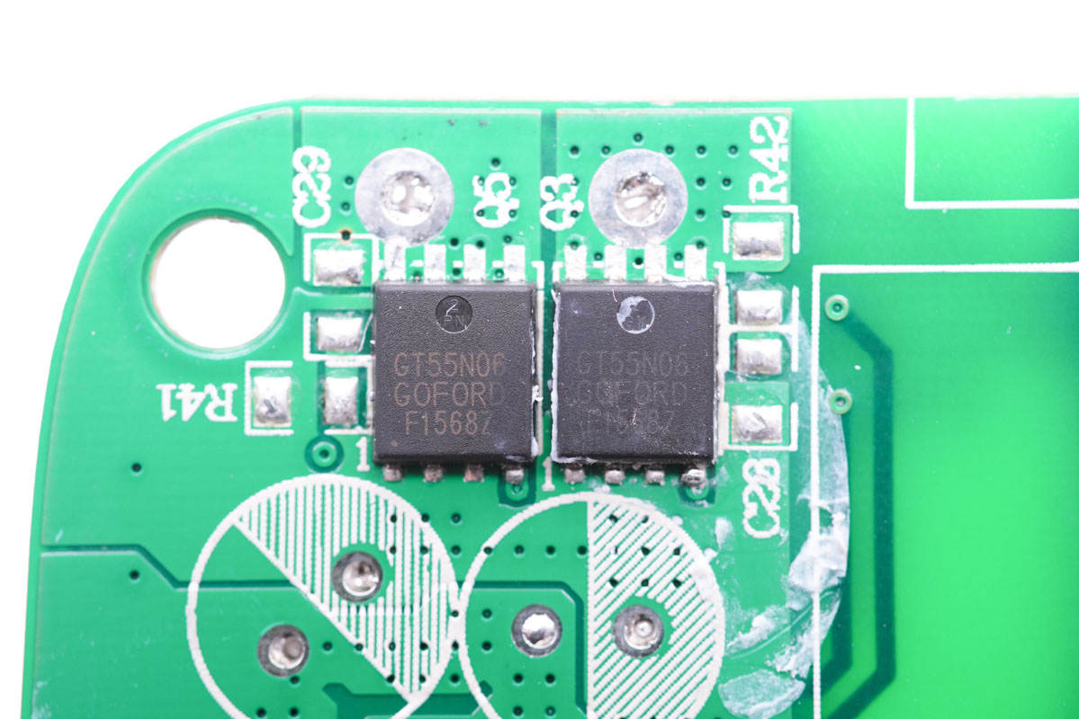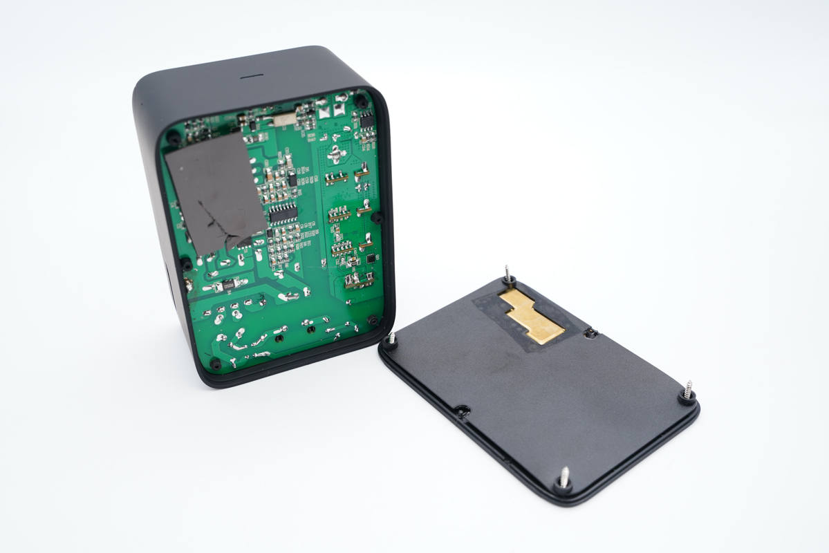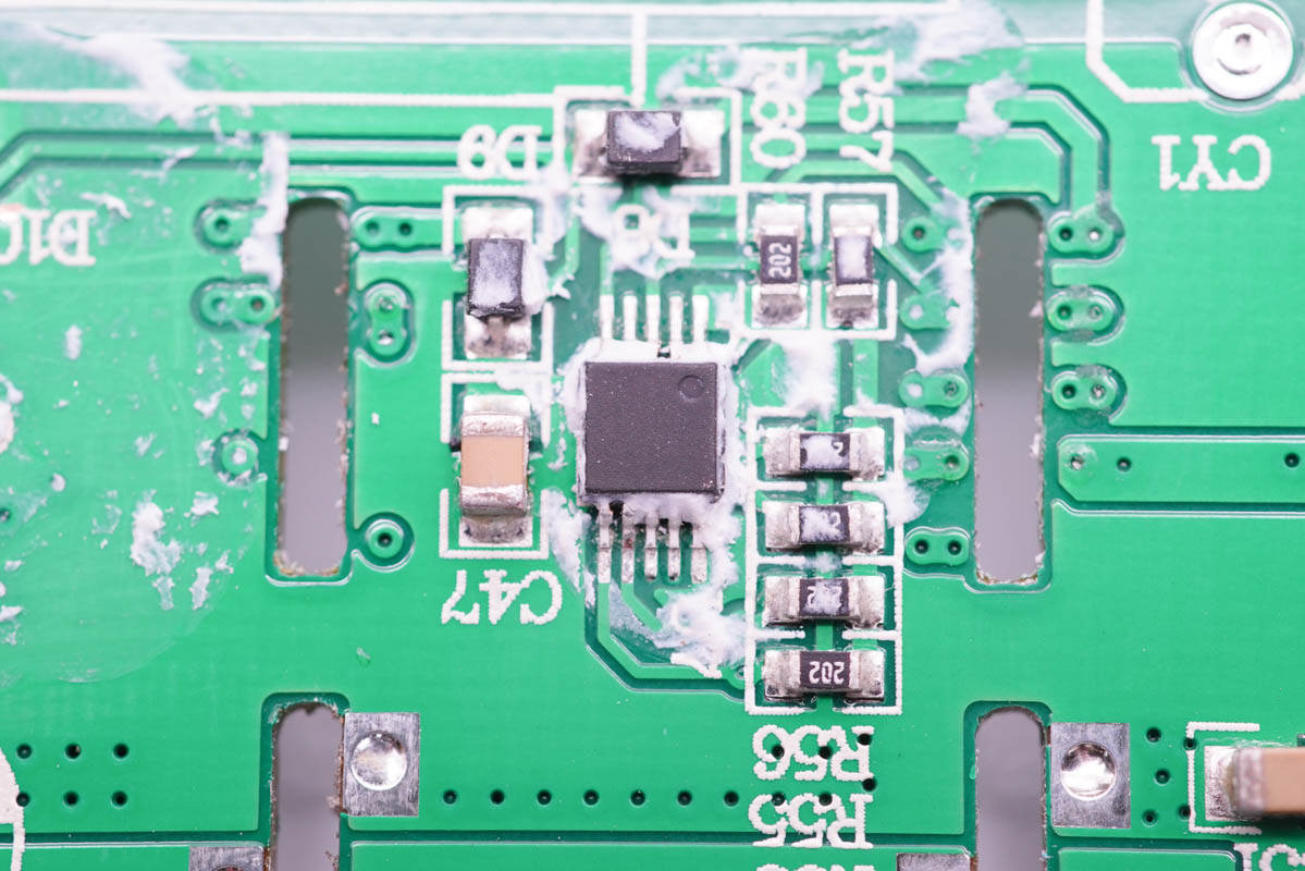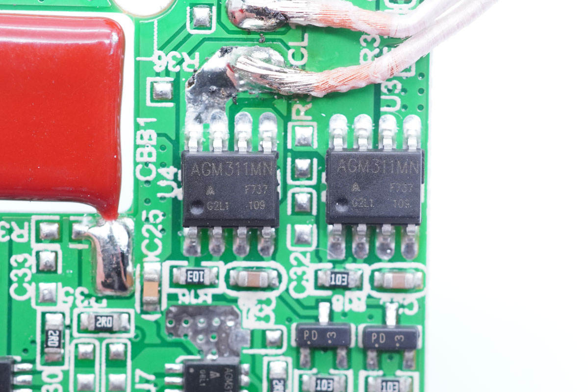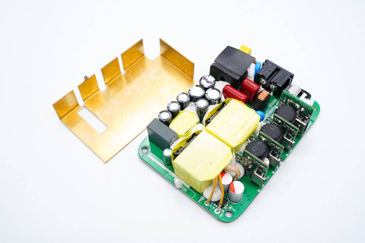 PCB板使用固定柱固定,導(dǎo)熱墊下是三顆氮化鎵功率芯片。