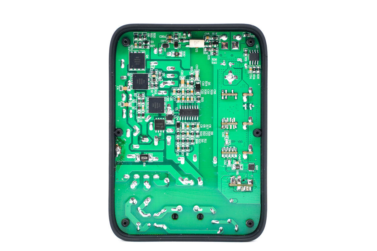 PCB板背面一覽,初次級分界明顯,最顯眼的莫過于右上角的三顆氮化鎵開關(guān)管。