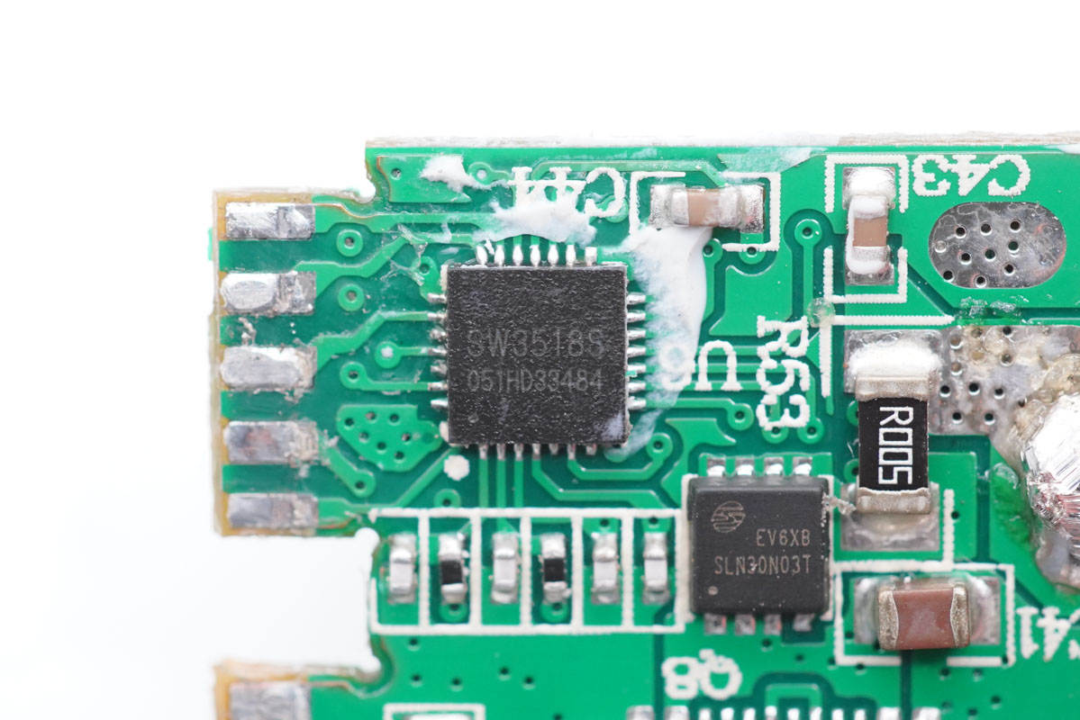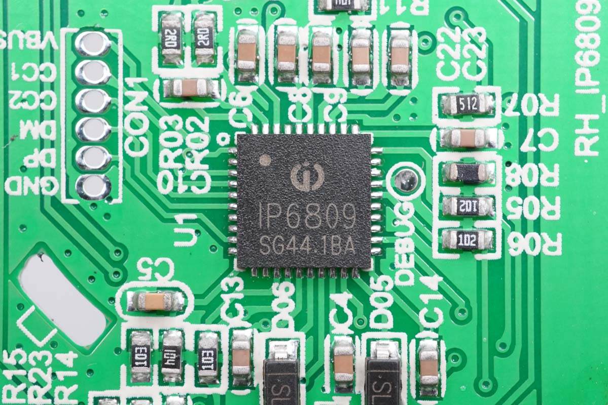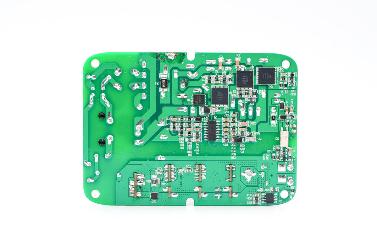 拆掉小板,發(fā)現(xiàn)主板上有一顆MCU,用于多口輸出功率智能分配。