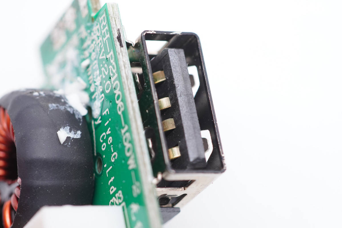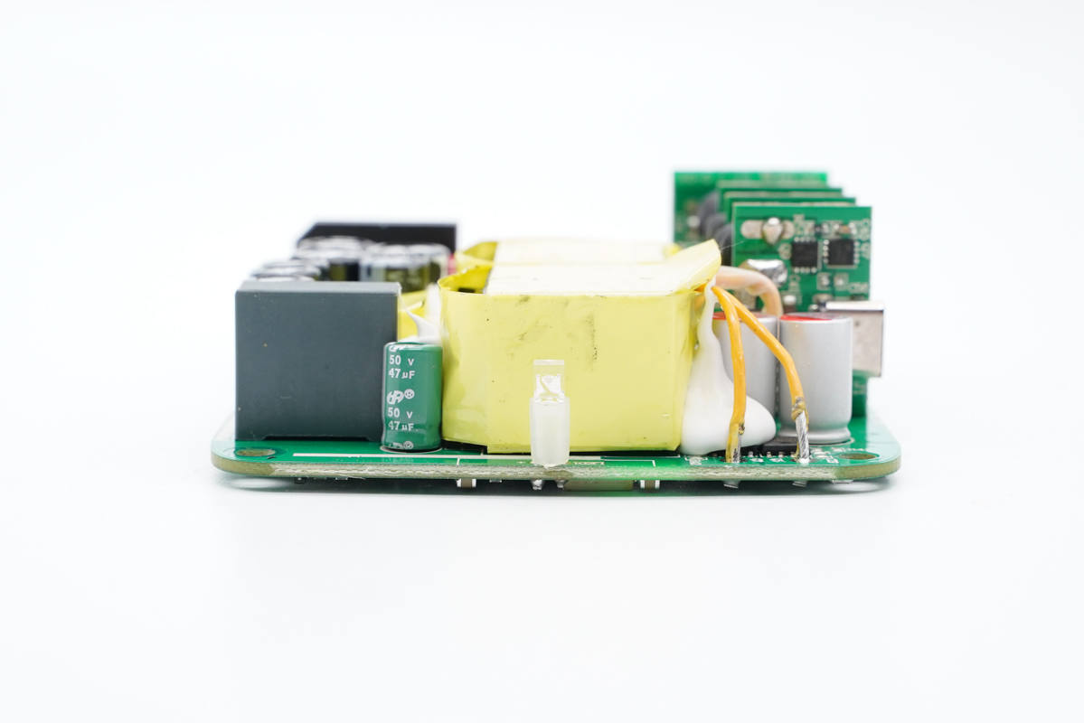PCB板正面一覽,電容、電感、變壓器等器件統(tǒng)統(tǒng)打膠加固,高壓側(cè)設(shè)有多達(dá)7顆高壓濾波電解電容,輸出端USB母座則均焊接在小板上,左側(cè)中間是PFC升壓電感和變壓器。