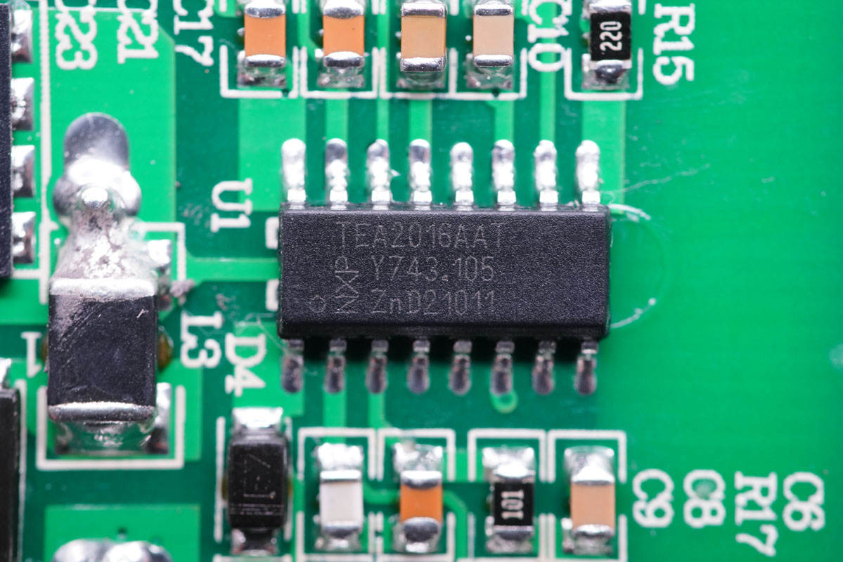 充電器主控芯片采用NXP恩智浦TEA2016AAT,內(nèi)置LLC控制器和PFC控制器,內(nèi)置數(shù)字架構(gòu)控制,簡化了設(shè)計的同時減少外圍元件數(shù)量,芯片內(nèi)置多重完善的保護(hù)功能。