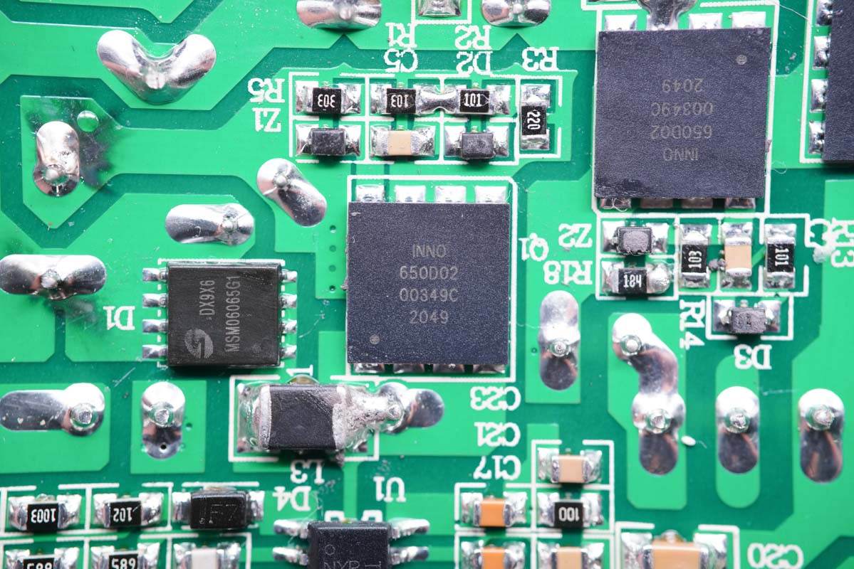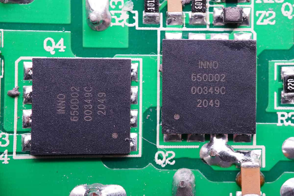 LLC開關(guān)電源的兩顆高壓開關(guān)MOS管也是采用的英諾賽科INN650D02氮化鎵功率芯片。