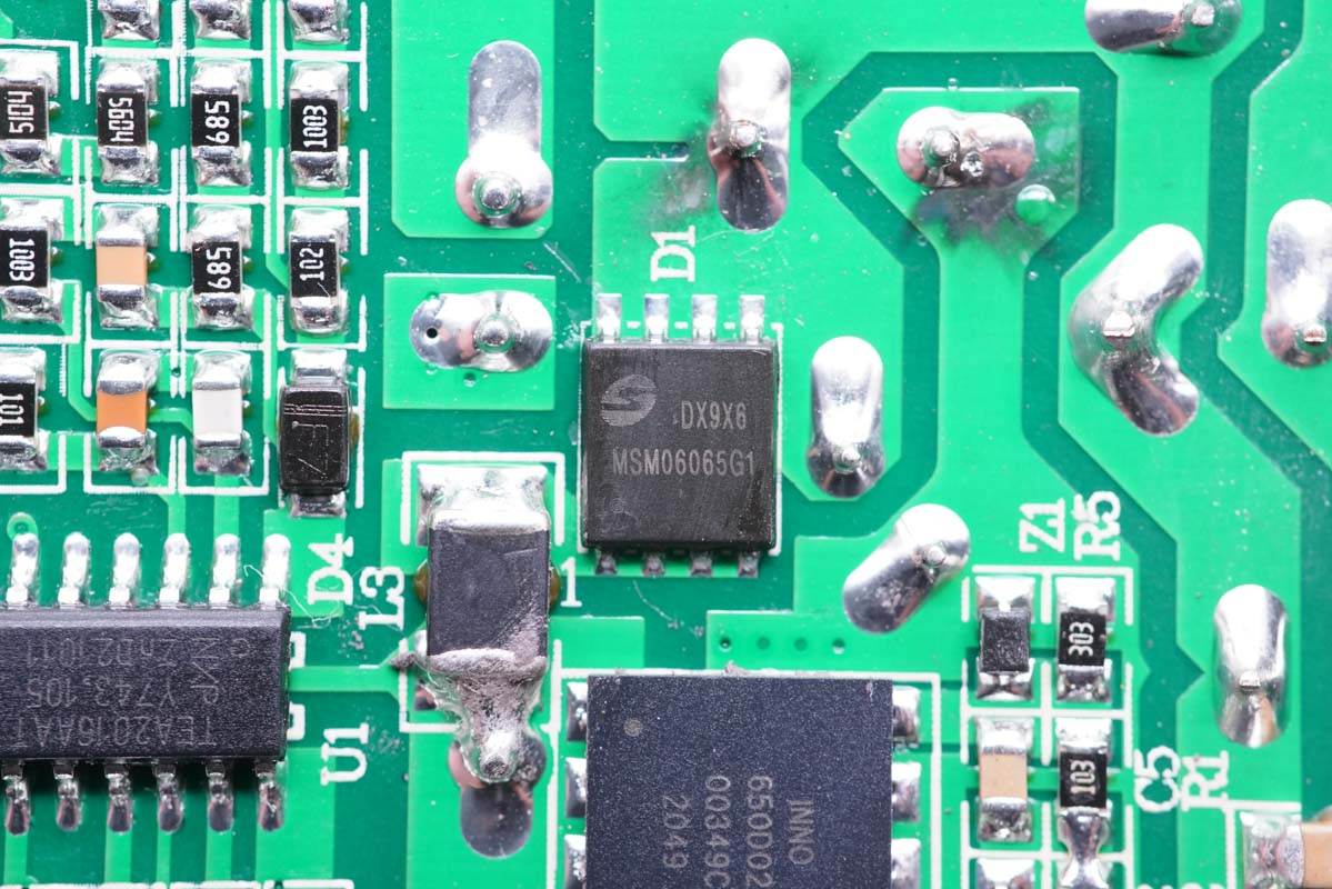 PFC升壓整流管特寫,為美浦森 MSM06065G1碳化硅二極管,采用DFN5*6封裝,超薄封裝節(jié)省體積,適用于高功率密度的大功率氮化鎵適配器中。