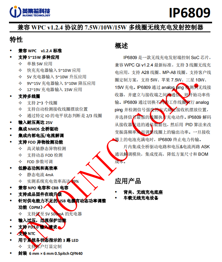 IP6809支持快充充電器輸入,5-15W輸出,支持2-3個線圈,內(nèi)部集成NMOS驅(qū)動和電壓電流解調(diào),支持異物檢測功能,低靜態(tài)功耗,高效率,兼容NPO和CBB電容,并且支持多種保護(hù)功能,采用QFN40封裝。