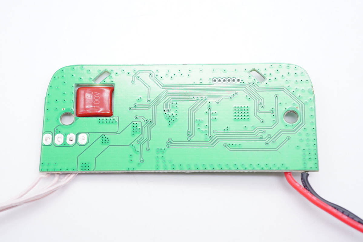 PCB板一側(cè)設(shè)有整流橋、高壓濾波電解電容、諧振電容等器件。