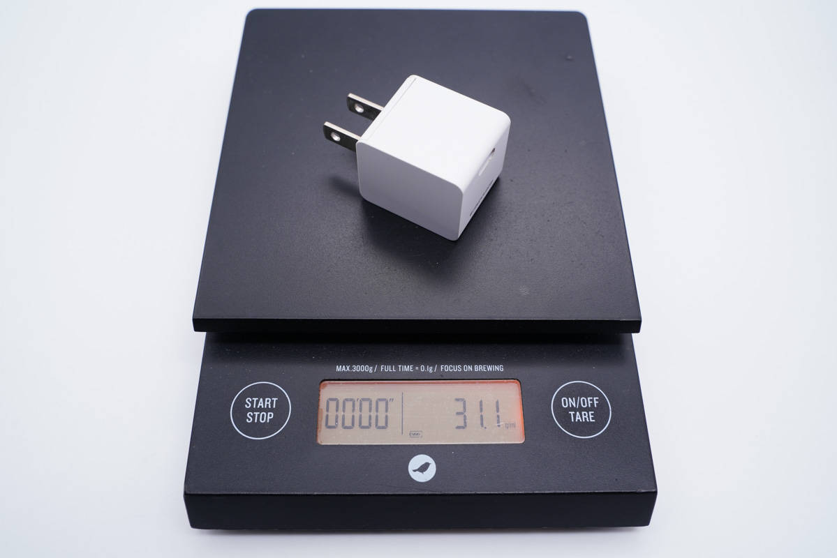 和蘋果20W充電器直觀對比,體積優(yōu)勢明顯。