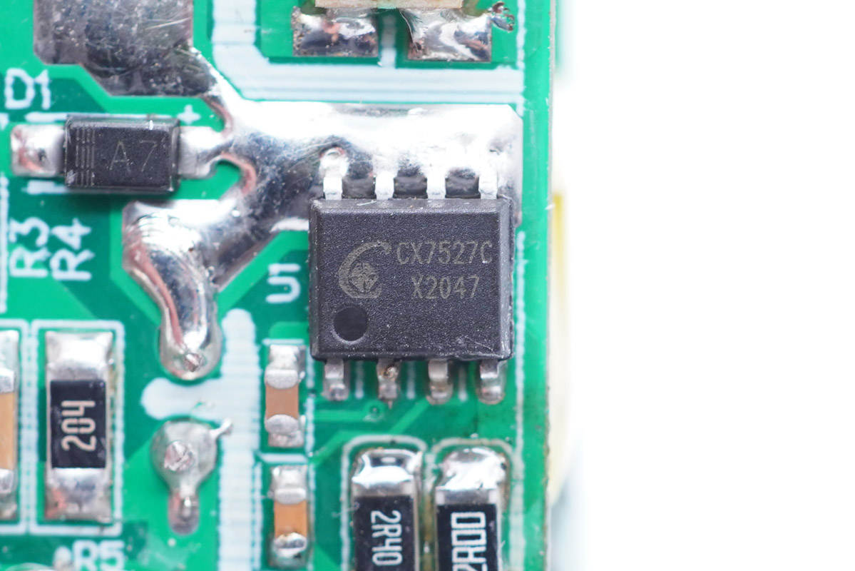 充電頭網(wǎng)通過拆解了解到,該充電器三塊PCB板組合焊接設(shè)計(jì),采用了誠芯微CX7527C+CX7538B高集成PD快充套片方案,有效簡化外圍電路,幫助充電器實(shí)現(xiàn)小型化。