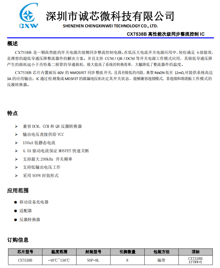 誠芯微CX7538B 支持開關(guān)電源的CCM/QR/DCM模式,非常適合3.3~12V快充同步整流使用,內(nèi)置耐壓60V,12mΩ的同步整流管,可提供3A輸出。比肖特基效率最高提升6%,工作電壓范圍寬,外圍元件非常簡單,在寬電壓應(yīng)用時(shí),外圍只需一顆電容。