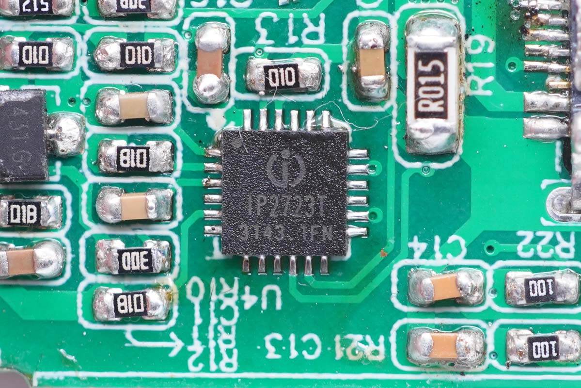協(xié)議芯片采用英集芯IP2723T,該芯片已通過USB IF協(xié)會(huì)PD3.0 PPS認(rèn)證,TID:3135,是一款集成多種協(xié)議、用于USB輸出端口的快充協(xié)議IC。支持多種快充協(xié)議,包括USB TypeC DFP、PD2.0/3.0、PPS 、HVDCP QC4、QC4+、QC3.0/2.0、FCP、SCP、AFC、MTK PE+ 2.0/1.1、Apple 2.4A、BC1.2以及三星2.0A。
