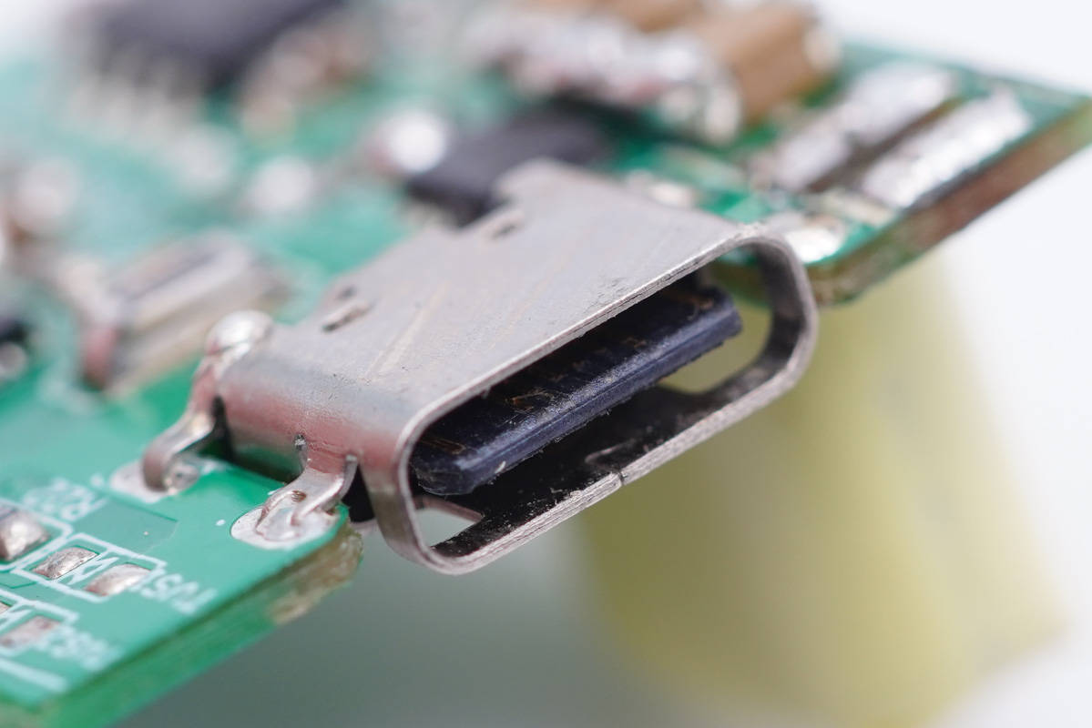 USB-C母座特寫,沉板過孔焊接。