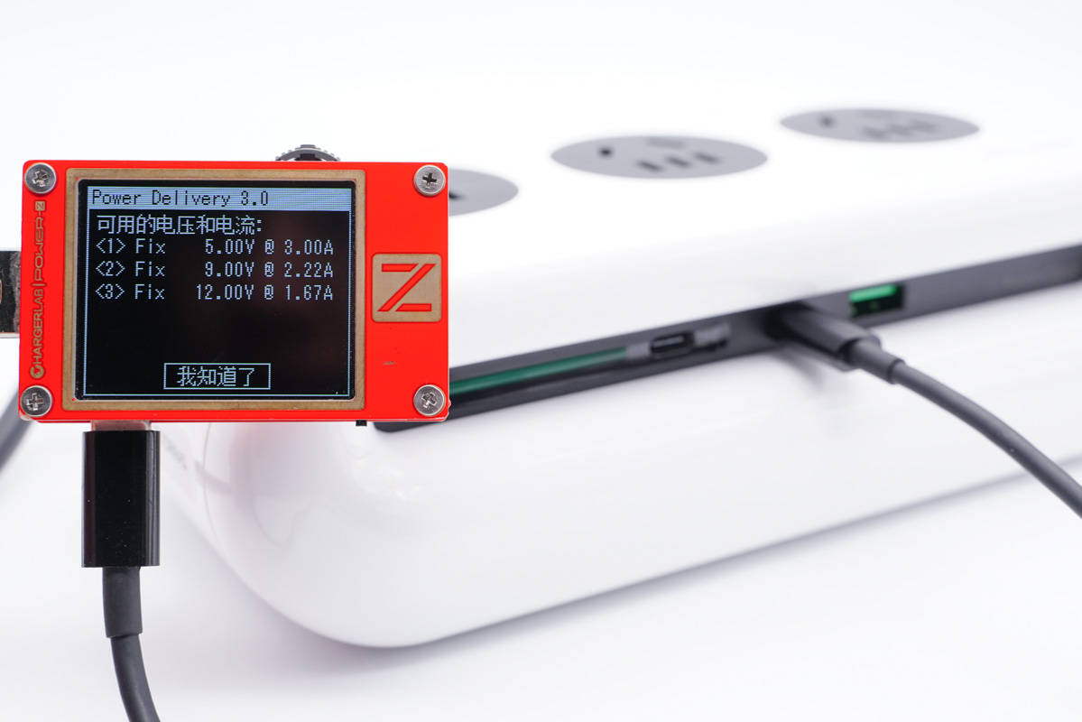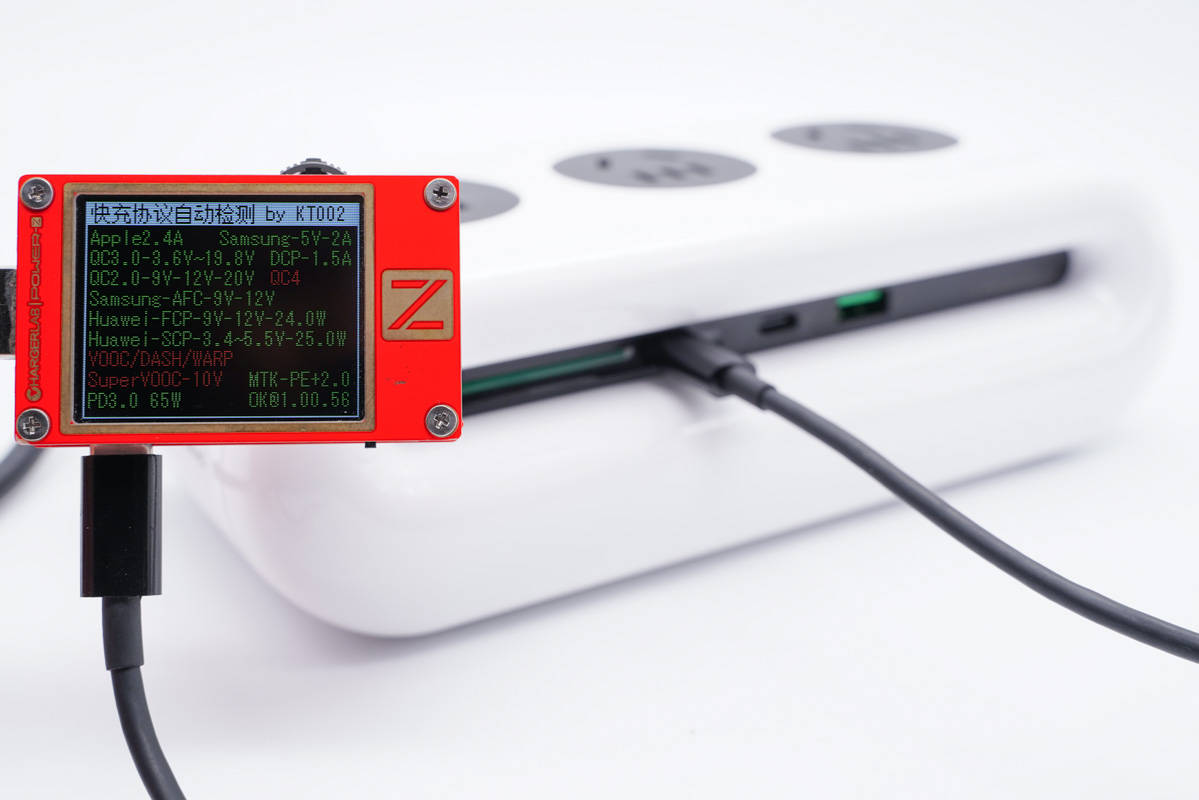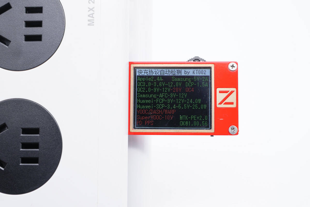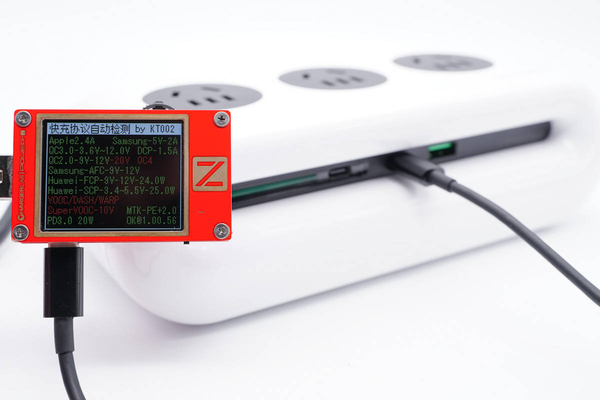 使用ChargerLAB POWER-Z KT002測得USB-C1口支持Apple 2.4A、Samsung 5V2A、DCP協(xié)議,以及QC2.0/3.0、AFC、FCP、SCP、PE2.0、PD3.0多個快充協(xié)議。