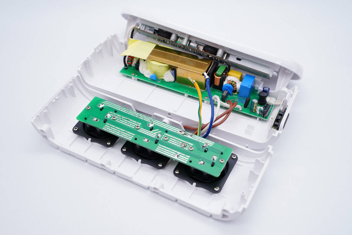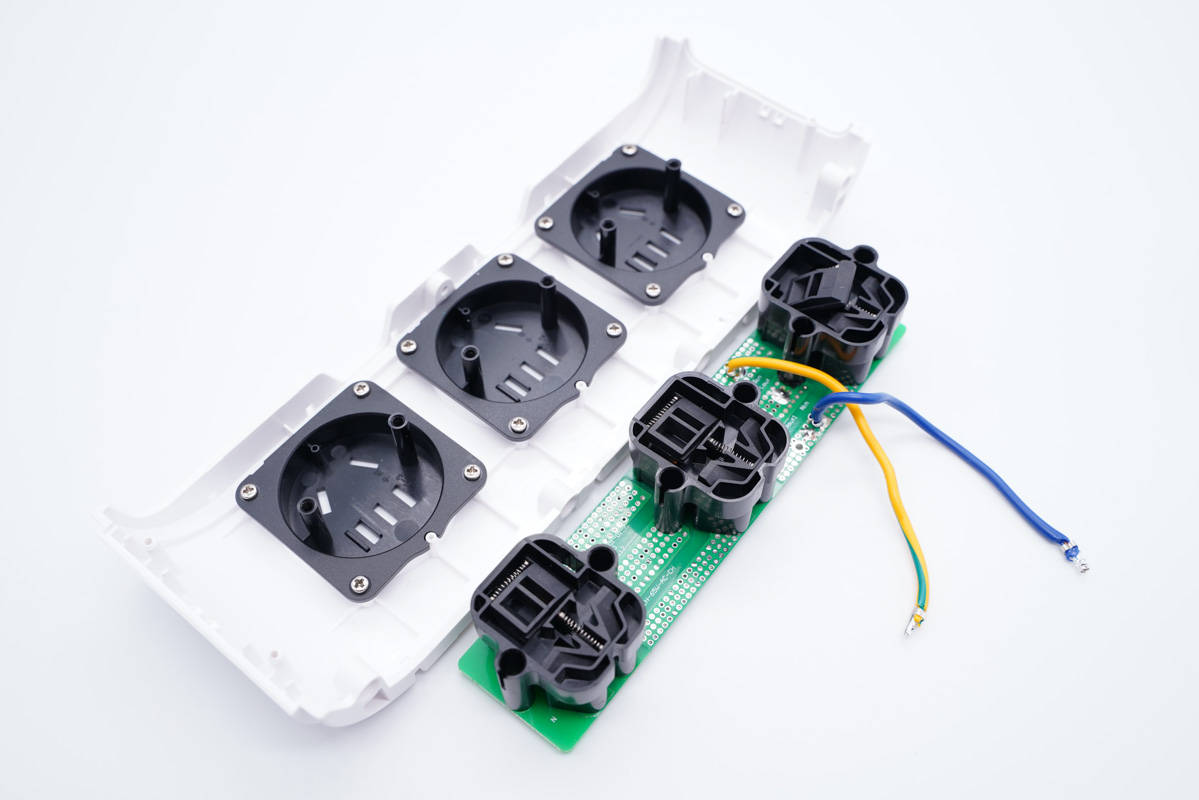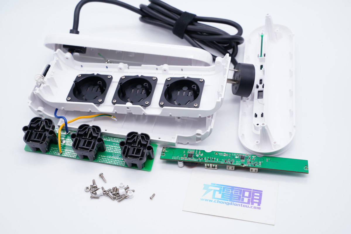 三個AC插口的金屬片焊接在小板上,板子使用螺絲固定在外殼內(nèi)部,黑色塑料殼也是使用螺絲固定。