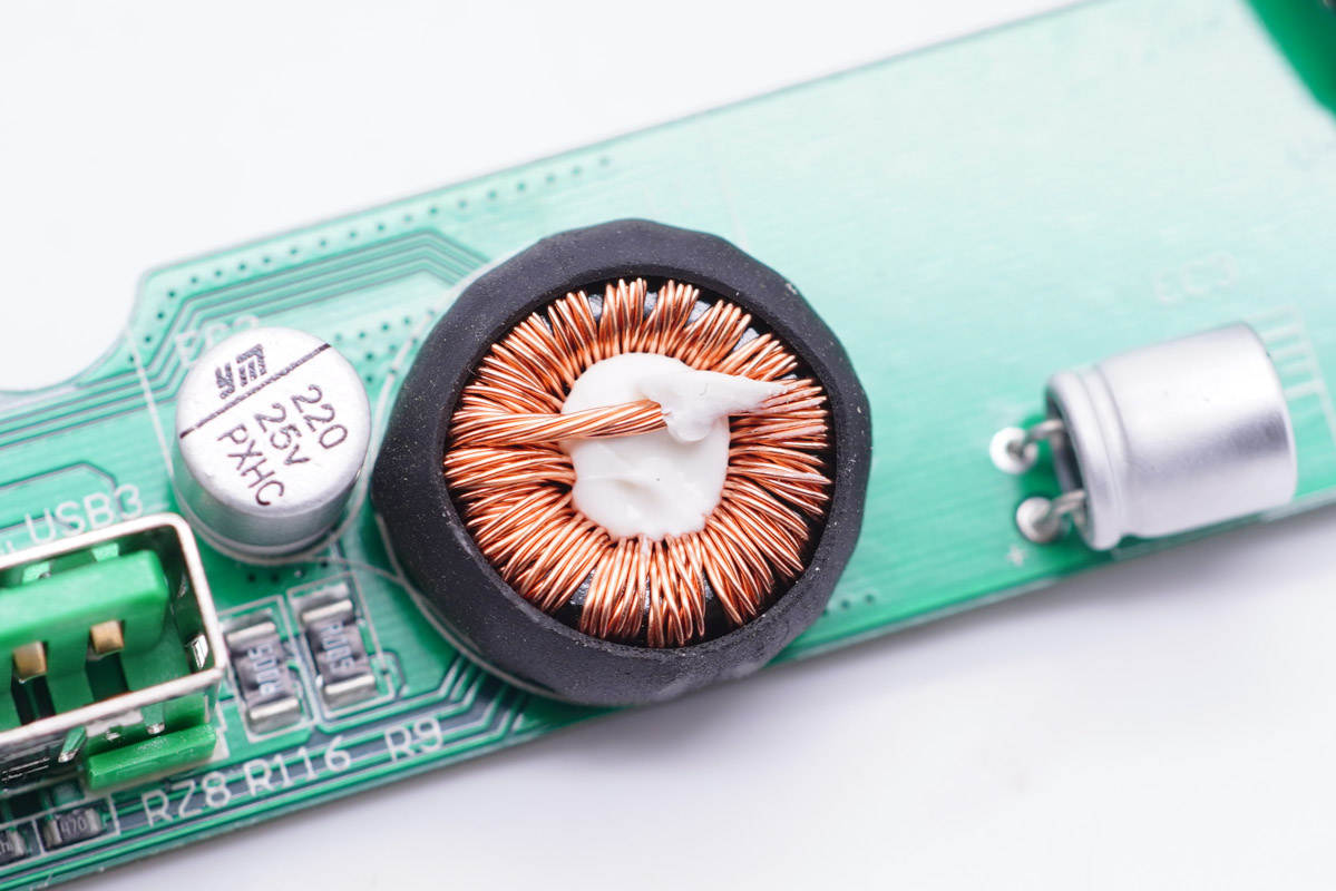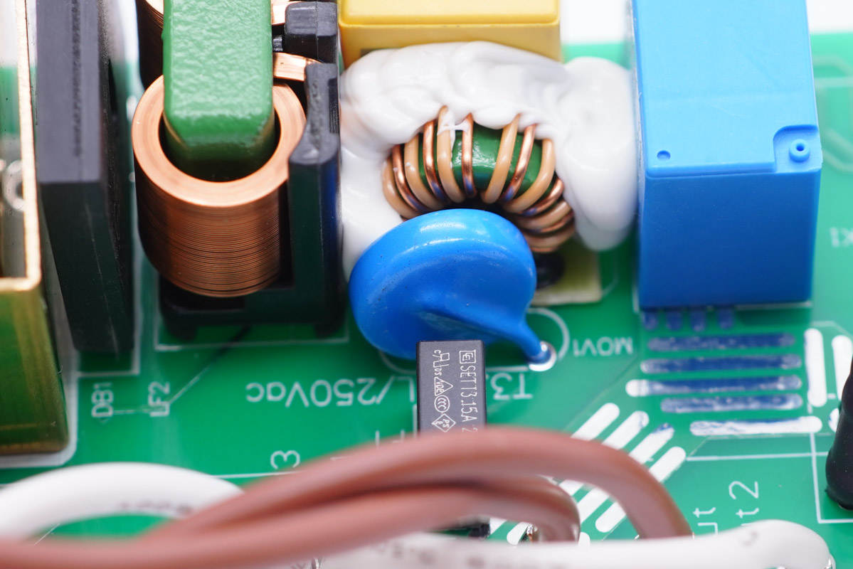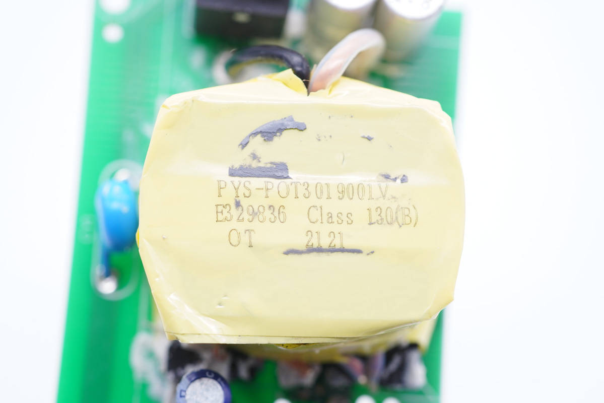 旁邊藍色的是壓敏電阻,中心的共模電感打膠,其左側(cè)還有一顆共模電感,兩級設(shè)計用于濾除EMI干擾。