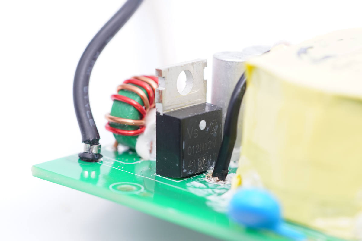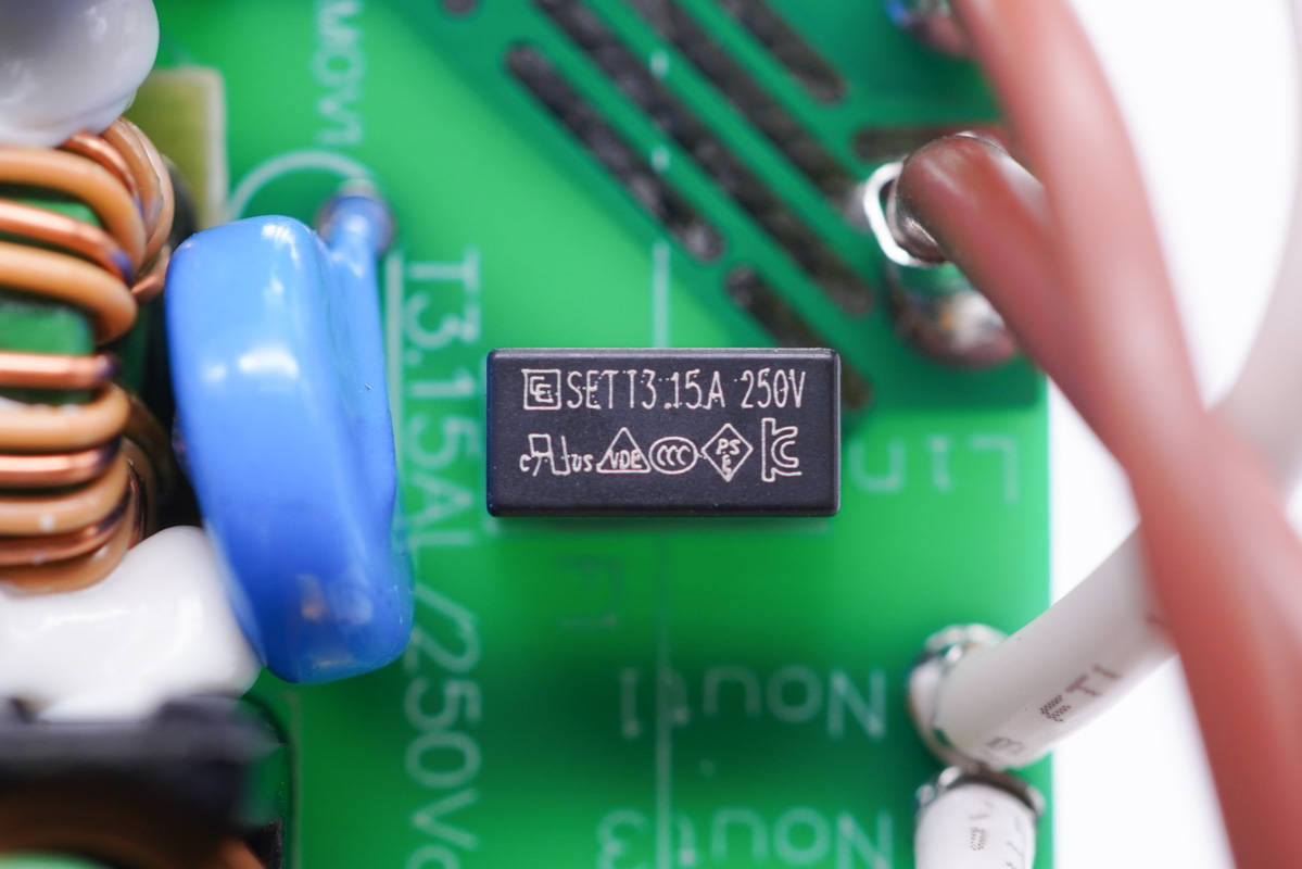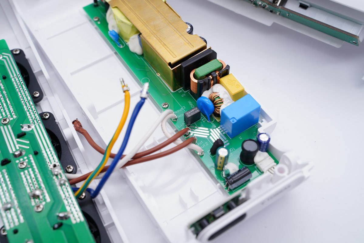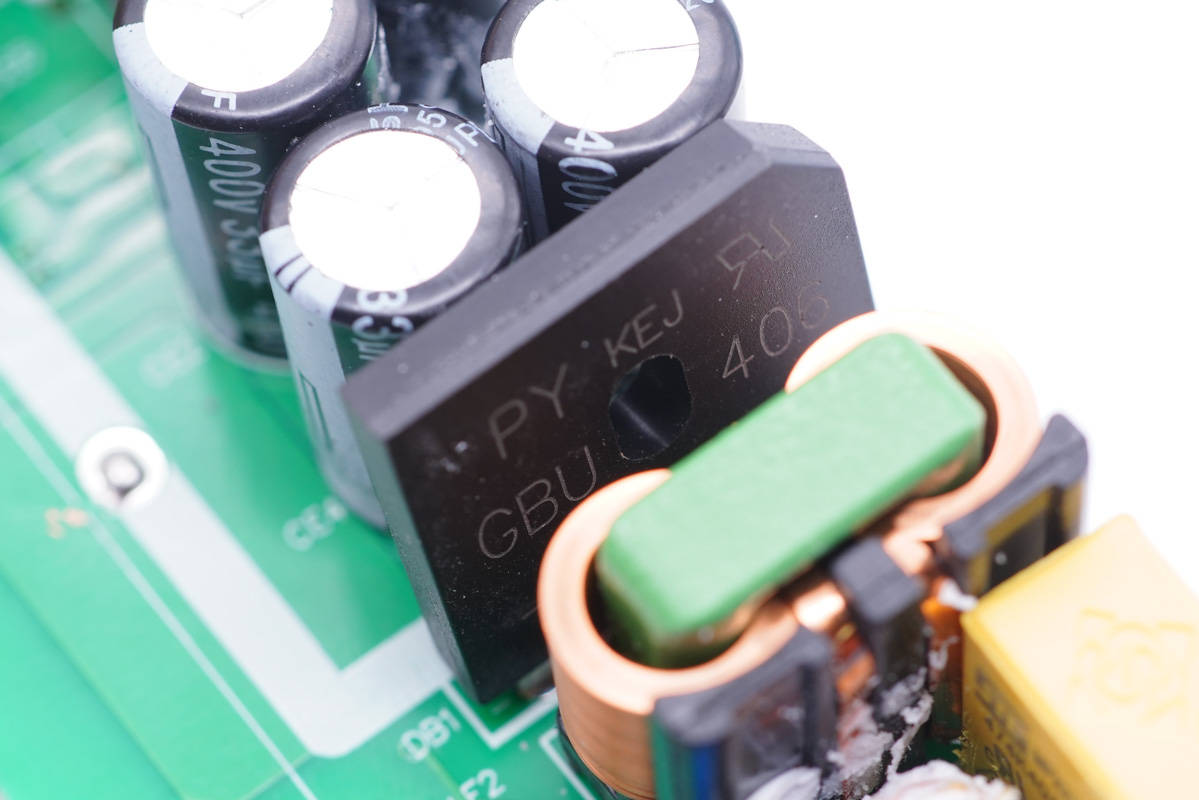 旁邊藍色的是壓敏電阻,中心的共模電感打膠,其左側(cè)還有一顆共模電感,兩級設(shè)計用于濾除EMI干擾。