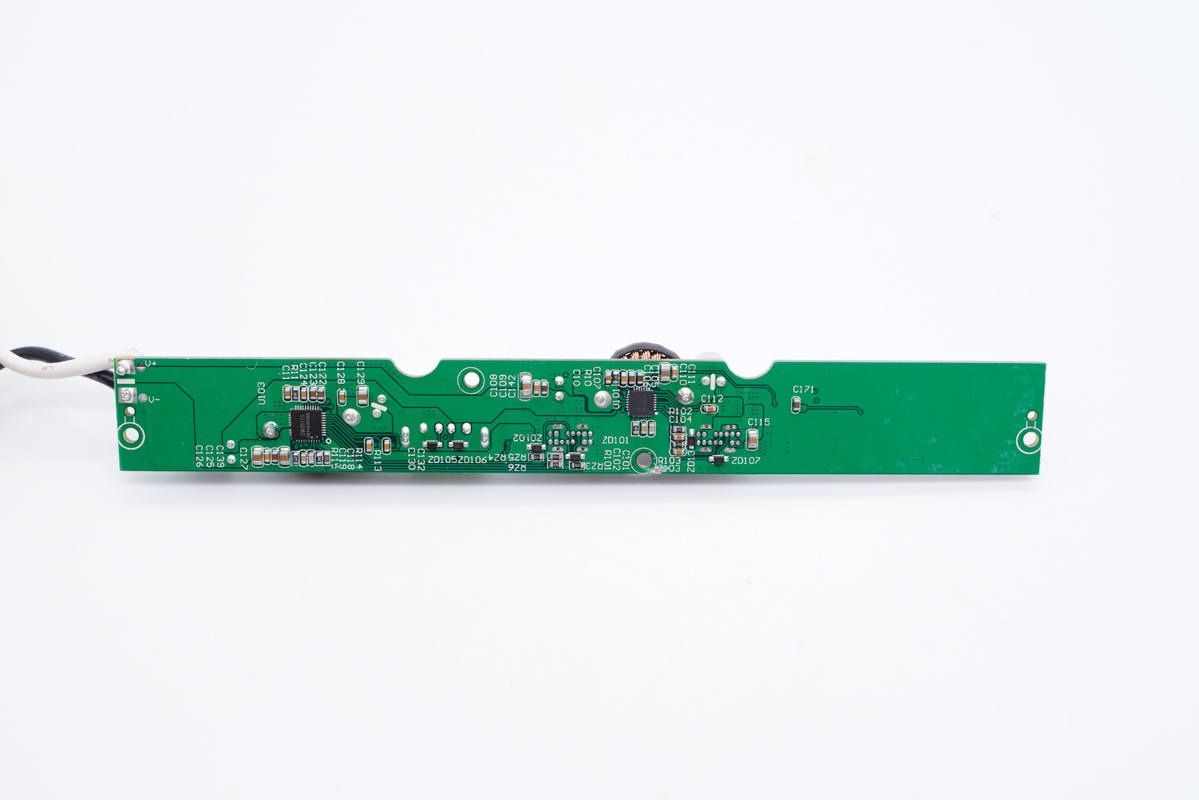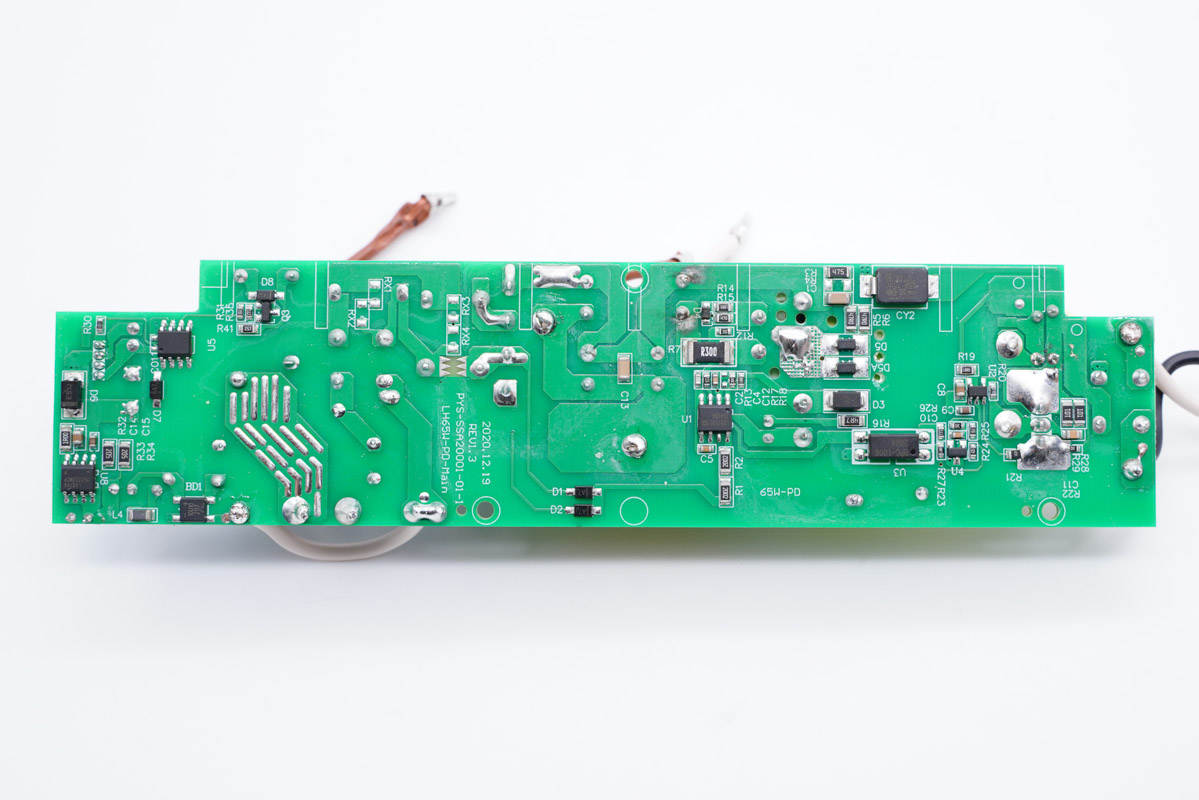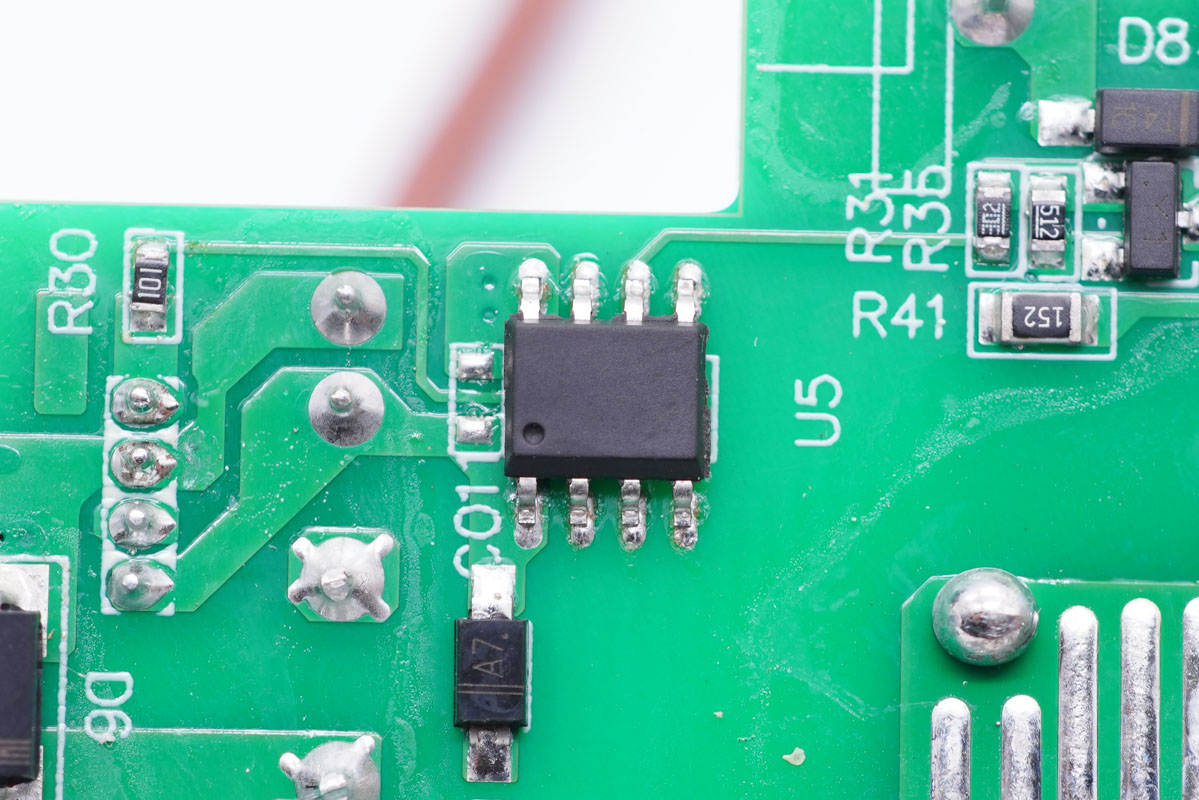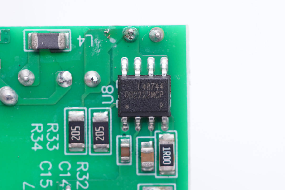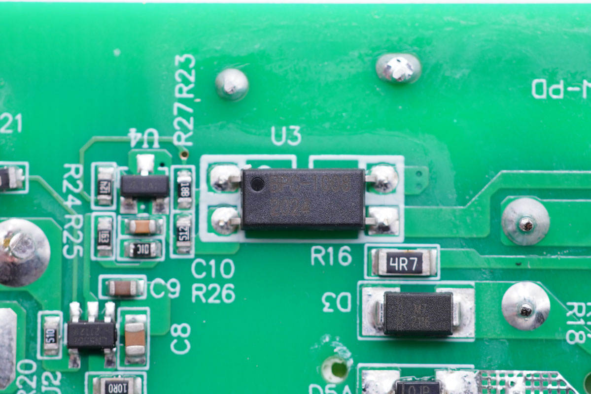 板子背面一覽,左側(cè)設(shè)有繼電器電路控制芯片,右側(cè)設(shè)有開關(guān)電源初次級控制器、光耦和貼片Y電容。