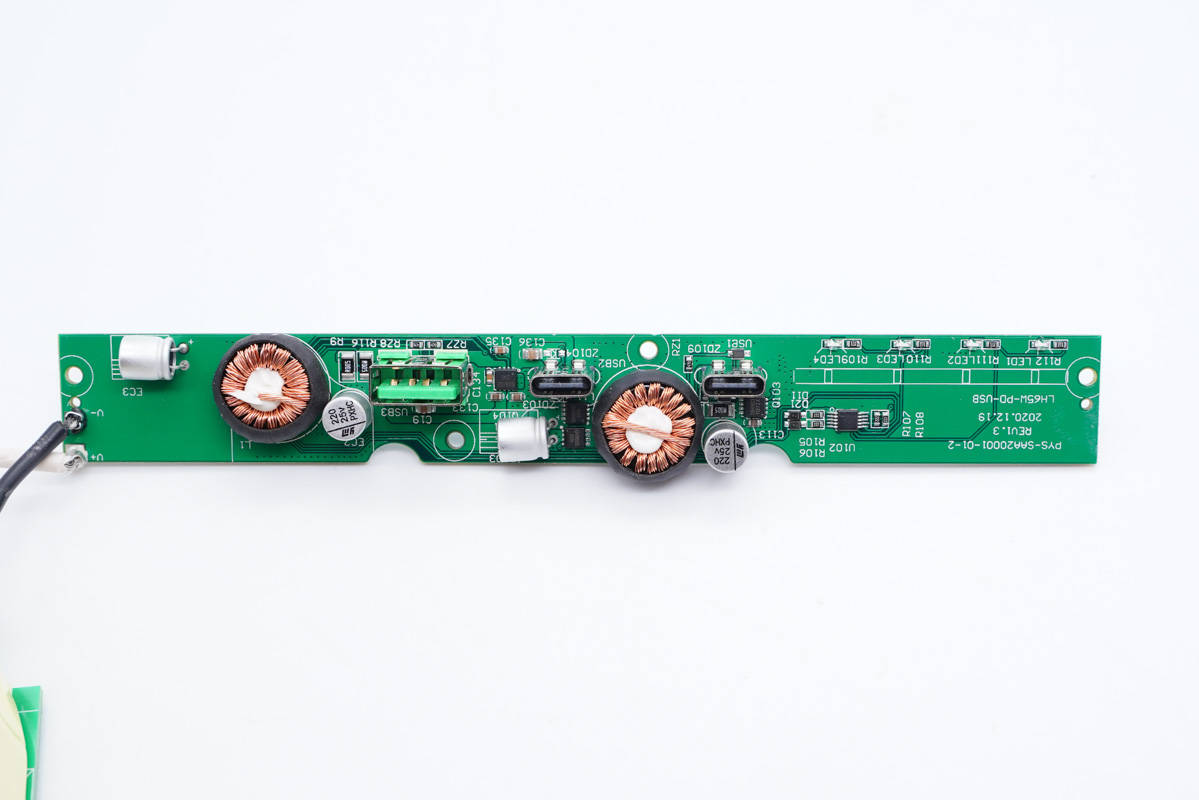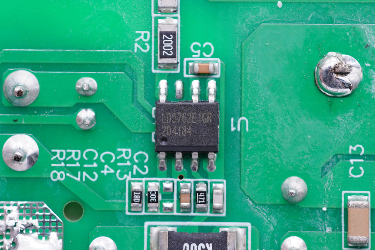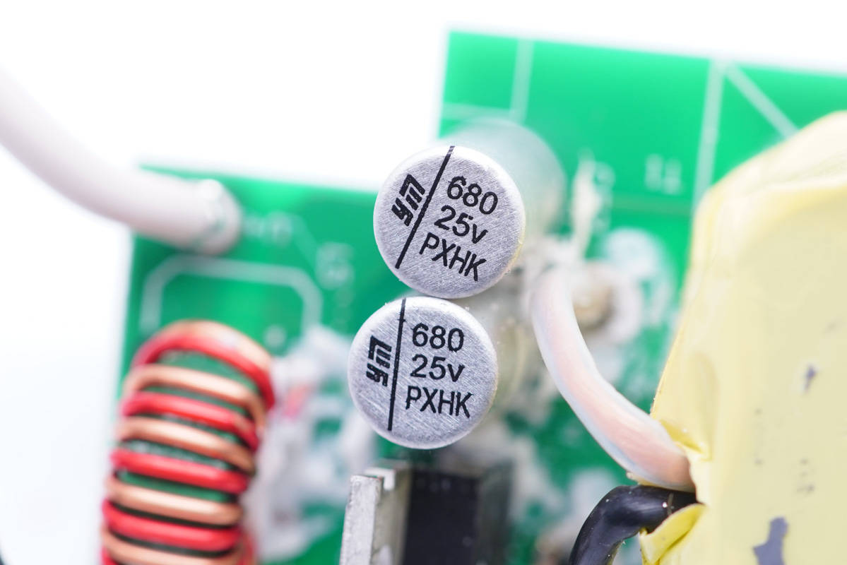 其中開關(guān)電源由通嘉LD5762E1搭配龍騰超結(jié)MOS管,以及力生美同步整流控制器搭配威兆VST012N12MS同步整流管組成,輸出端兩路二次降壓電路采用智融SW3516H和SW3517S方案。初級側(cè)采用四顆艾華電容濾波,次級側(cè)全部采用永銘NPX系列固態(tài)電容濾波,整體的用料十分可靠。