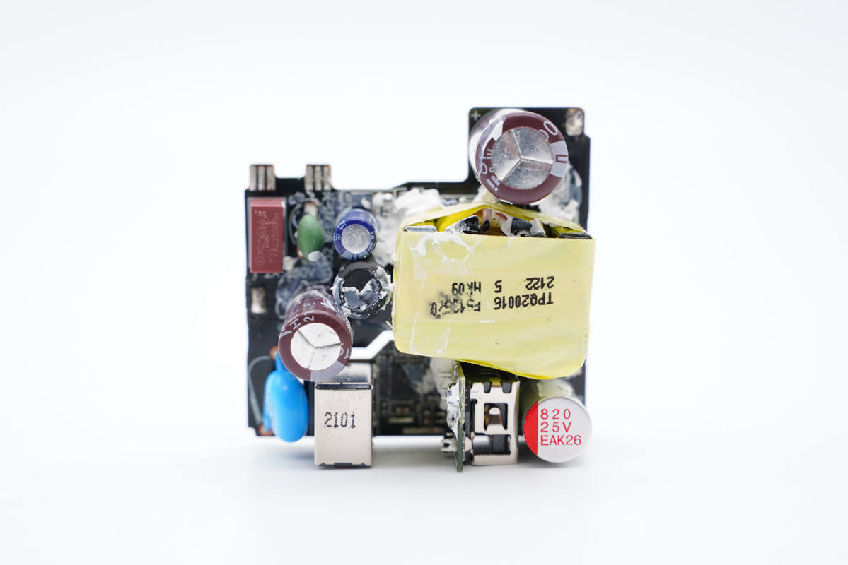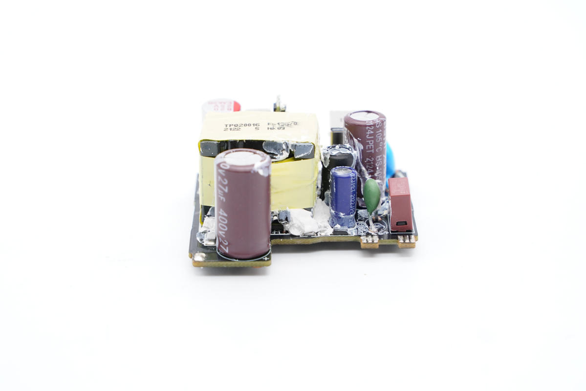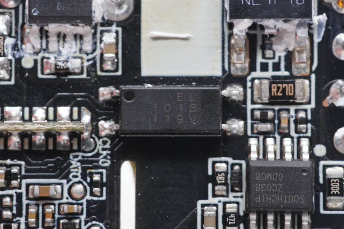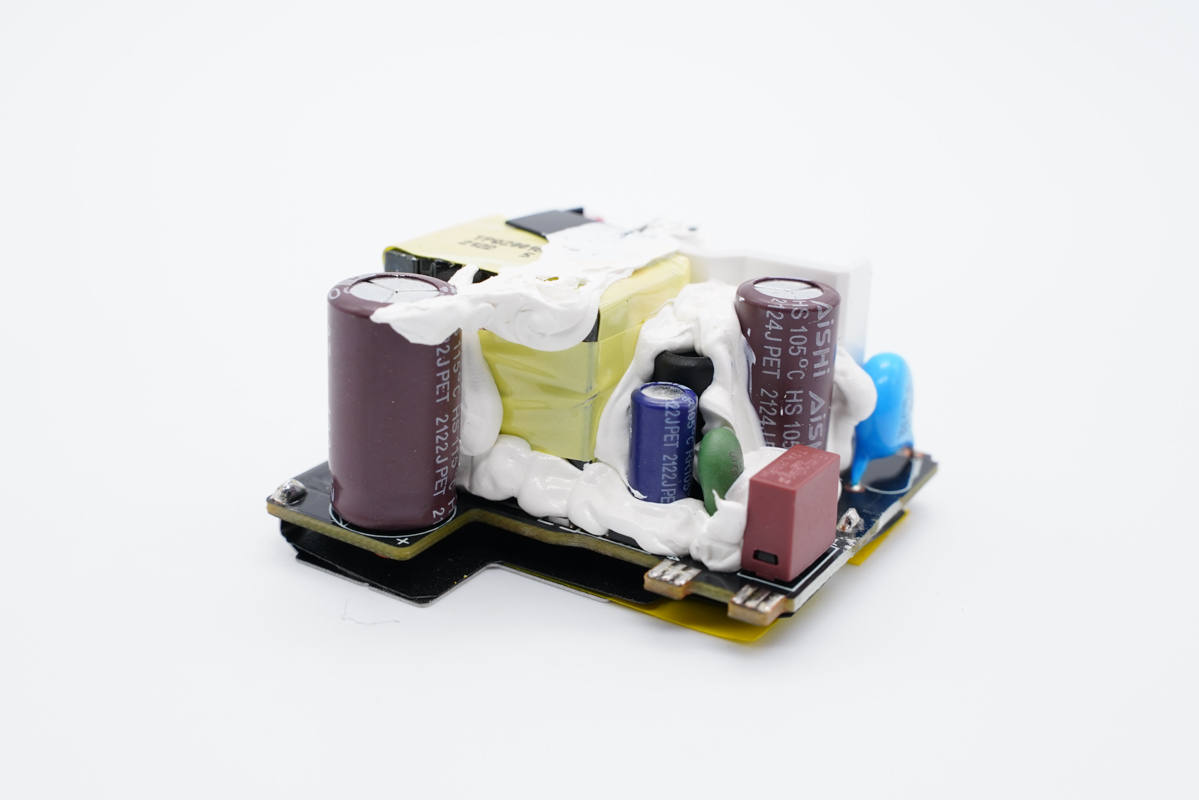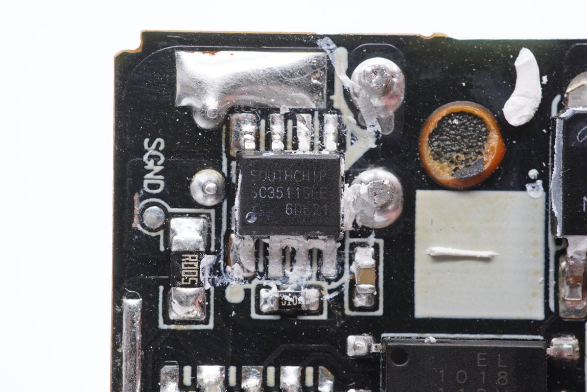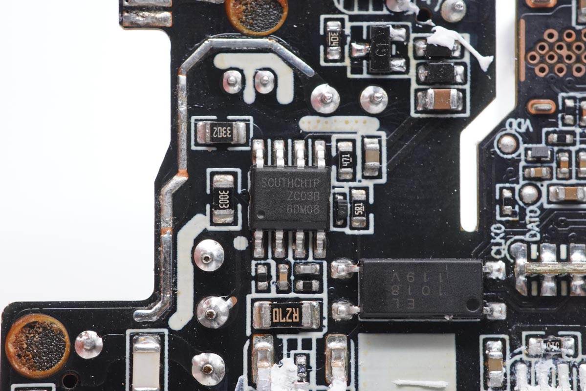 充電頭網通過拆解了解到,這款充電器內部采用了南芯的開關電源方案,使用南芯ZC03B定制反激控制器搭配AOS高壓MOS管,次級采用南芯SC3511一體化同步整流芯片。通過英飛凌CYPD3174進行協議控制。初級使用艾華電解電容濾波,輸出使用固態電容濾波,用料扎實可靠。