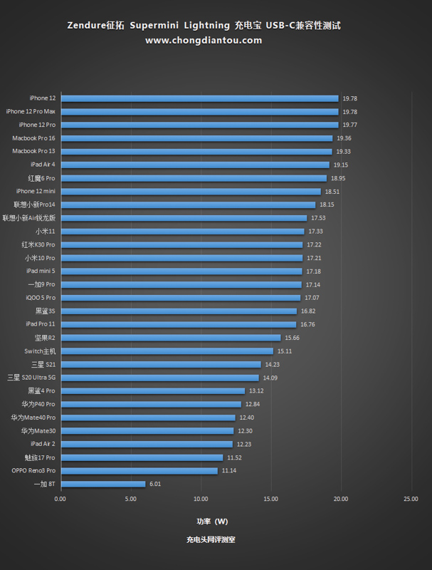 將輸出功率匯總成表,可以看到對 iPhone 12系列的支持非常好,均能達到19W左右,對其他支持PD充電協議的手機也能達到18W左右,只是對一加 8T 的兼容性較差一些。