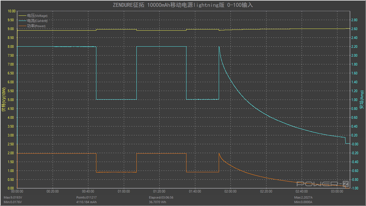 使用蘋果96W PD充電器對 Zendure 征拓 Supermini Lightning 充電寶充電,充電曲線可謂是一波三折,充電功率在9W和19W來回起跳,1小時54分鐘后功率開始逐步減小,全程耗時約3小時3分鐘。