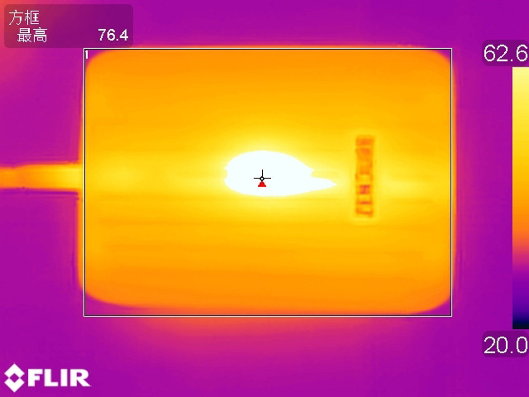 正面最高溫度集中在充電寶中心區域,最高76.4℃,這也是主板所在的位置。