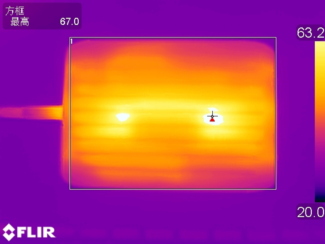 反面同理,最高溫度集中在中心,最高67℃。