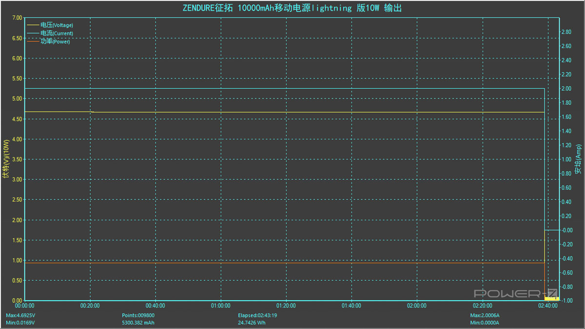 使用5V2A 檔位對充電寶進行輸出效率測試,整個輸出過程平穩,持續約2小時40分鐘,測試放出電量為24.7426Wh,所以在10W輸出測試中輸出效率約為24.7426Wh/36Wh=68.73%。