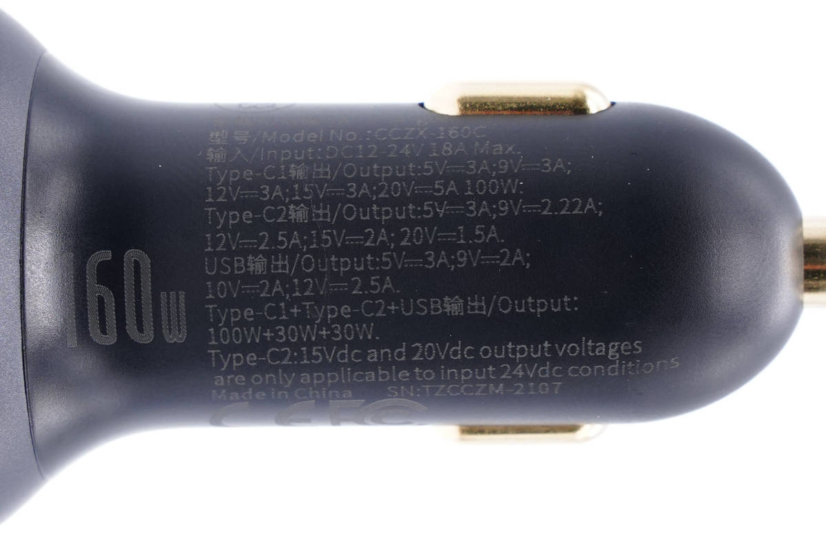 倍思這款160W車充機身采用流線型設計,整體過渡圓潤,頭部外殼還噴砂處理看上去很有金屬質感。車充配備時下熱門的2C1A接口,兼容QC、AFC、FCP、SCP、PE、PD3.0、PPS快充協議,具備5-20V齊全電壓檔位,兼容性很好。此外支持100W+30W+30W三口同時快充,性能強悍,可以滿足三臺設備同時大功率快充需求。
