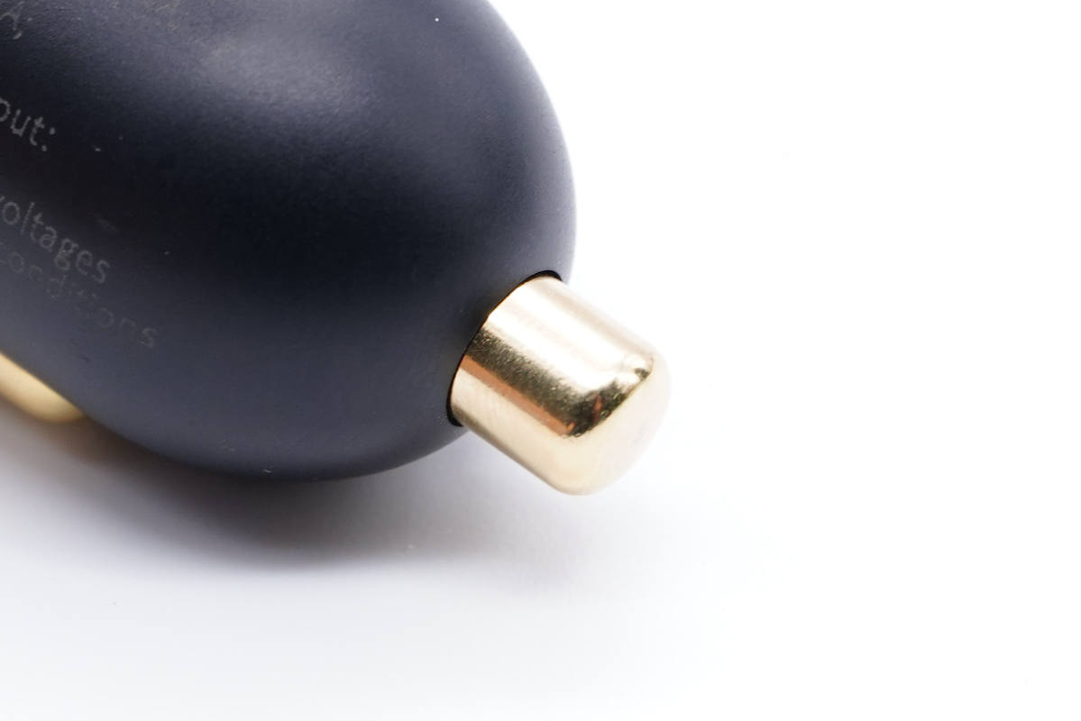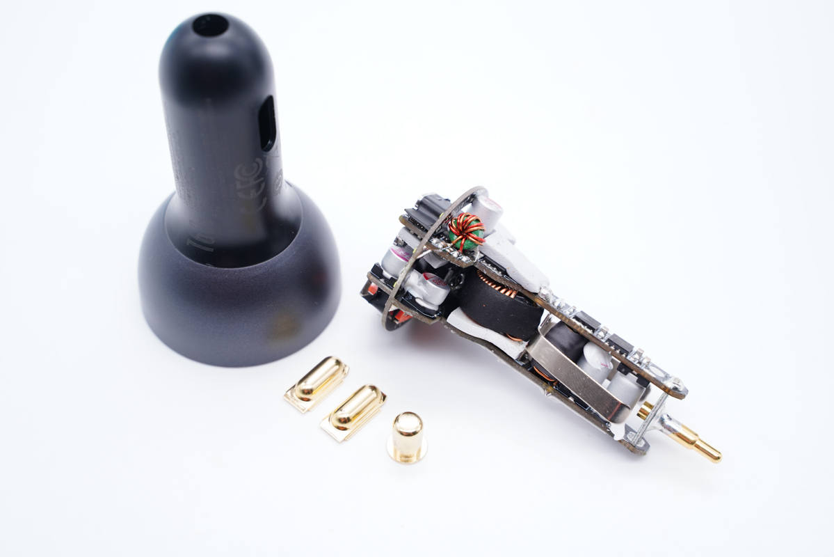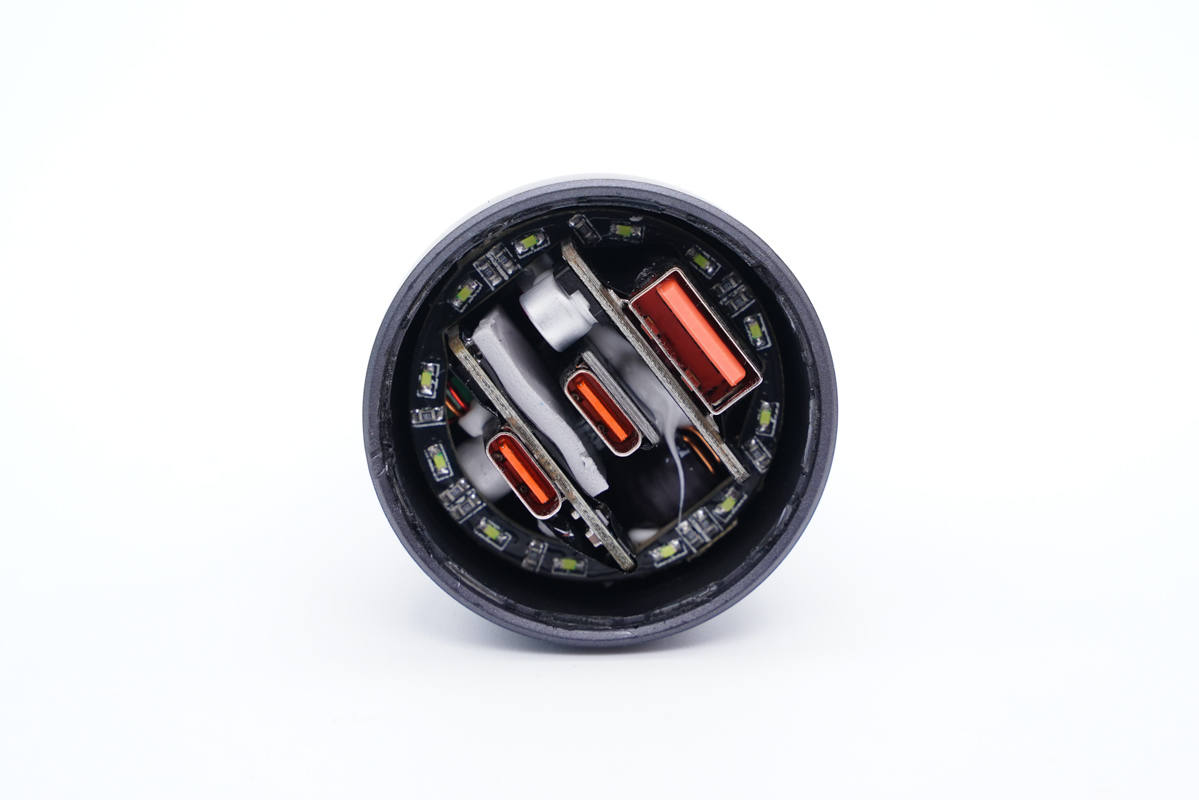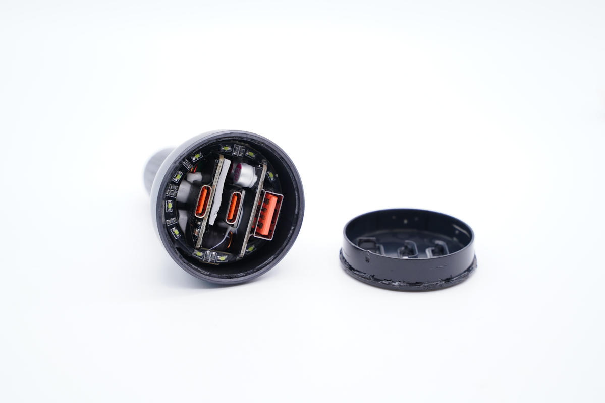 車充由兩部分塑料殼拼接而成,整體造型像一個蓮蓬。上端部分外殼噴刷銀灰色涂料,看上去有金屬質感。