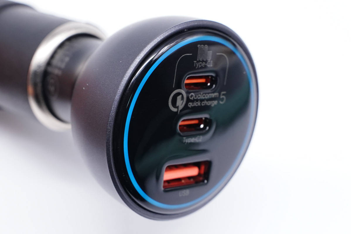 車充頂面高光亮面設計,配有時下熱門的2C1A三個接口,均采用紅色膠芯,C1口旁還印有100W和高通QC5認證標識。