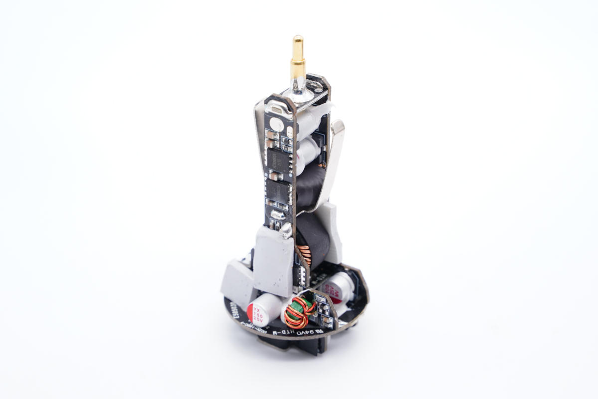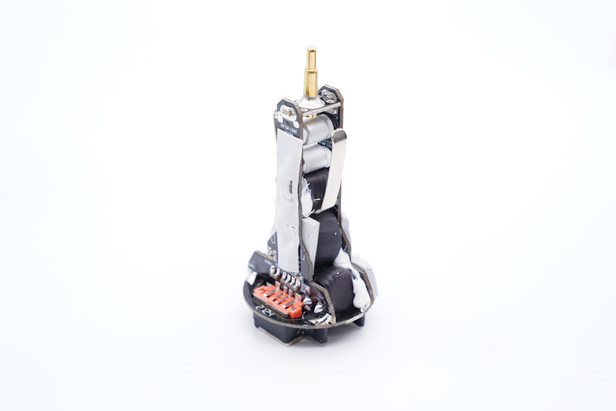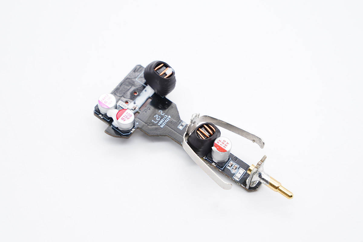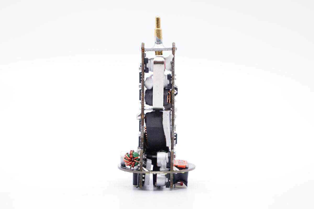 側面看去,兩塊電路板通過輸入端小板和負極金屬片錫焊連接,電感外套絕緣管保護。