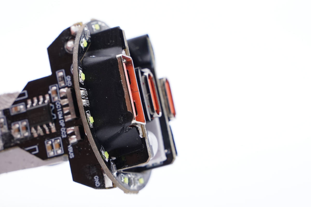 三個USB母座焊接在三塊小板上,之間有導熱墊填充,外圍是環形LED燈板。