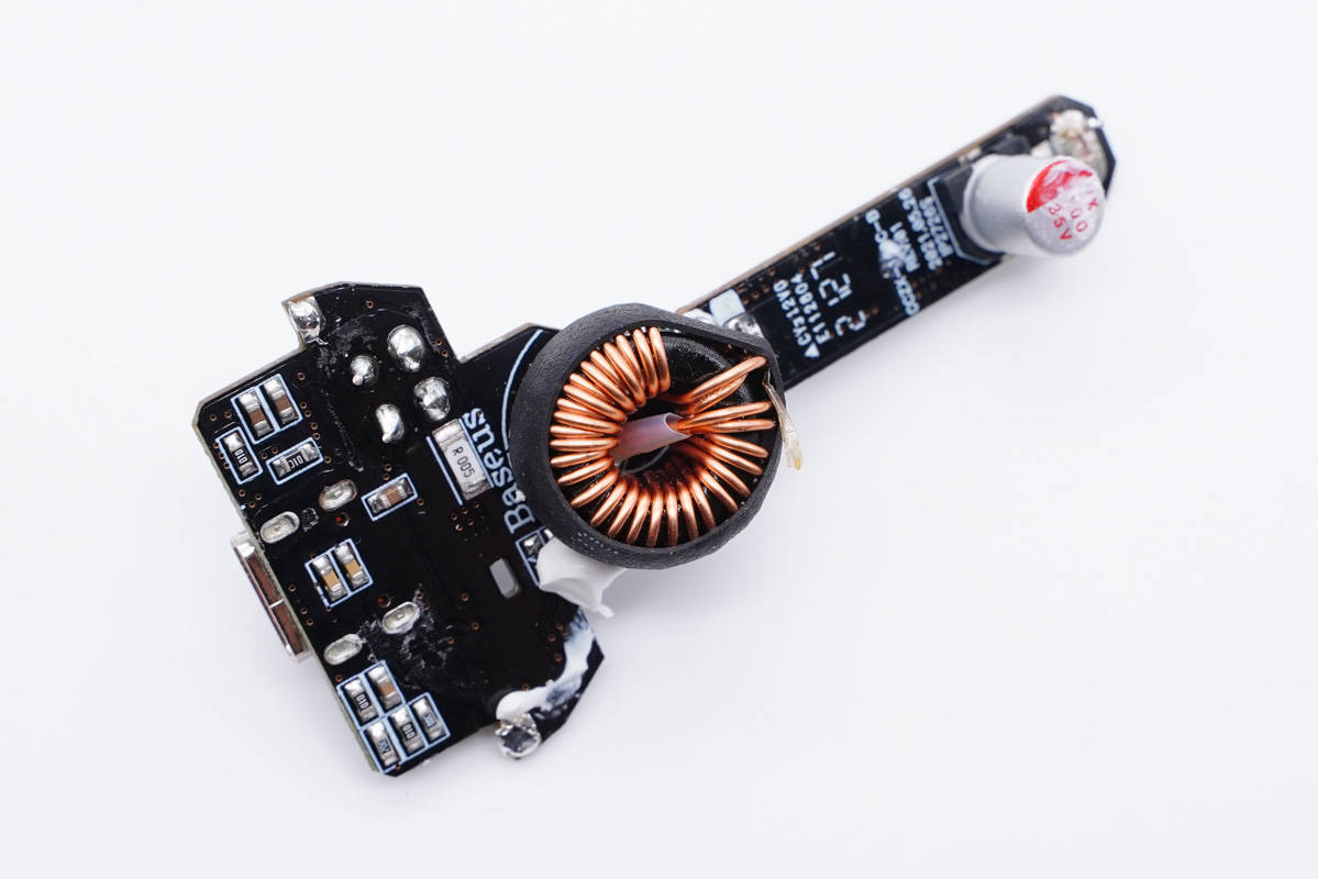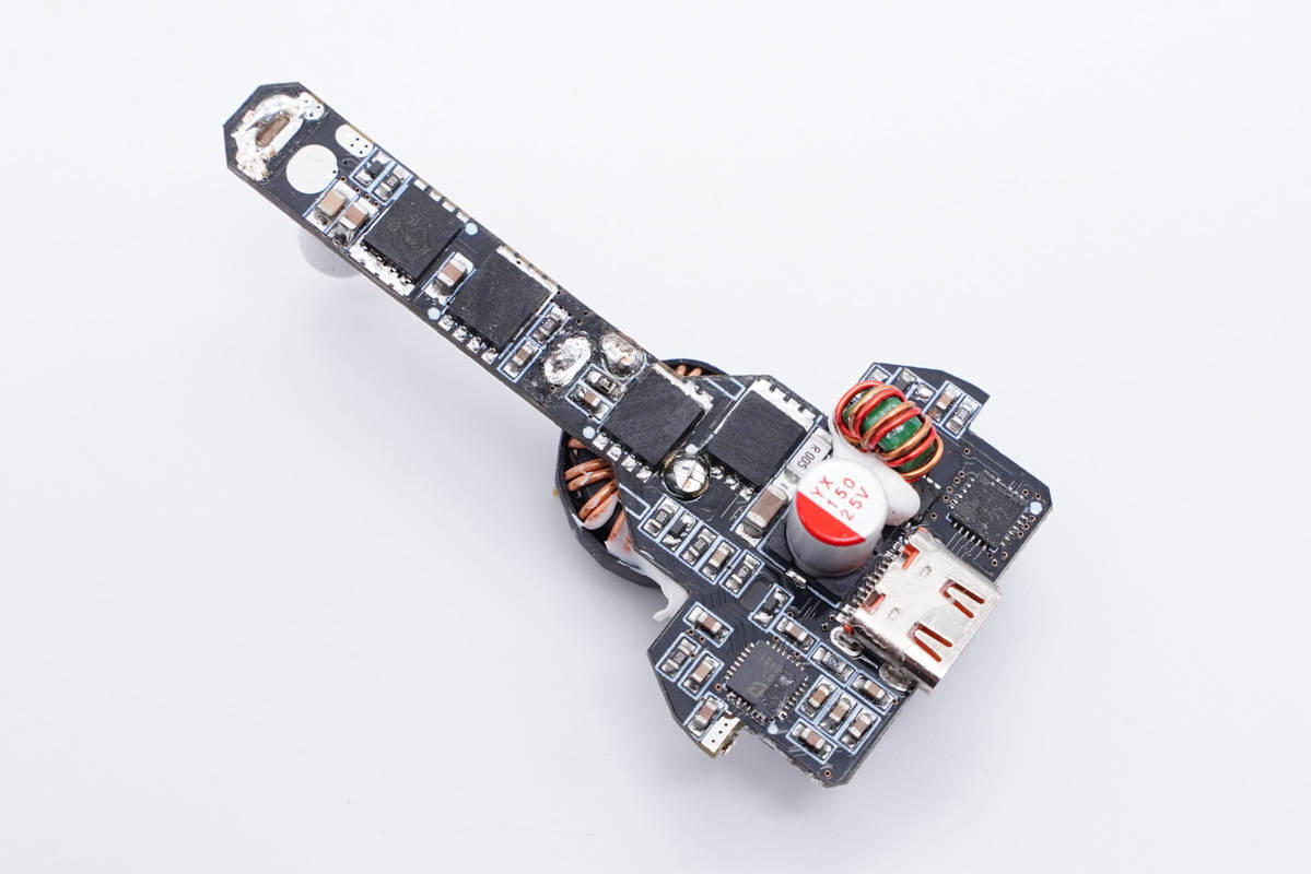USB-C1母座所在小板正面設有升降壓控制器、四顆MOS管、輸出濾波電容和濾波電感、協議芯片,電容電感打膠加固。