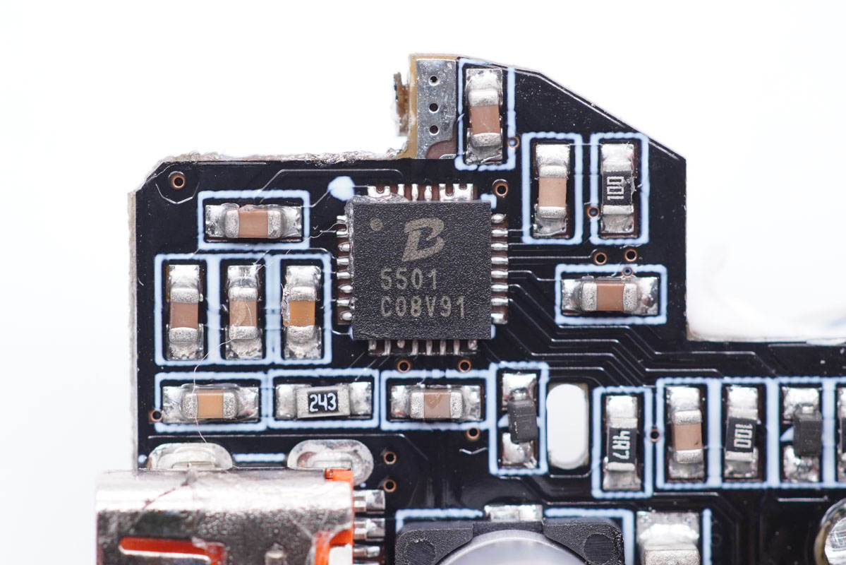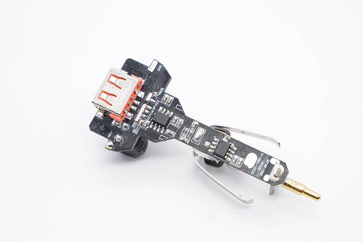 USB-A母座所在小板一面設有兩顆降壓協議IC,分別用于C2口和A口輸出電壓控制。