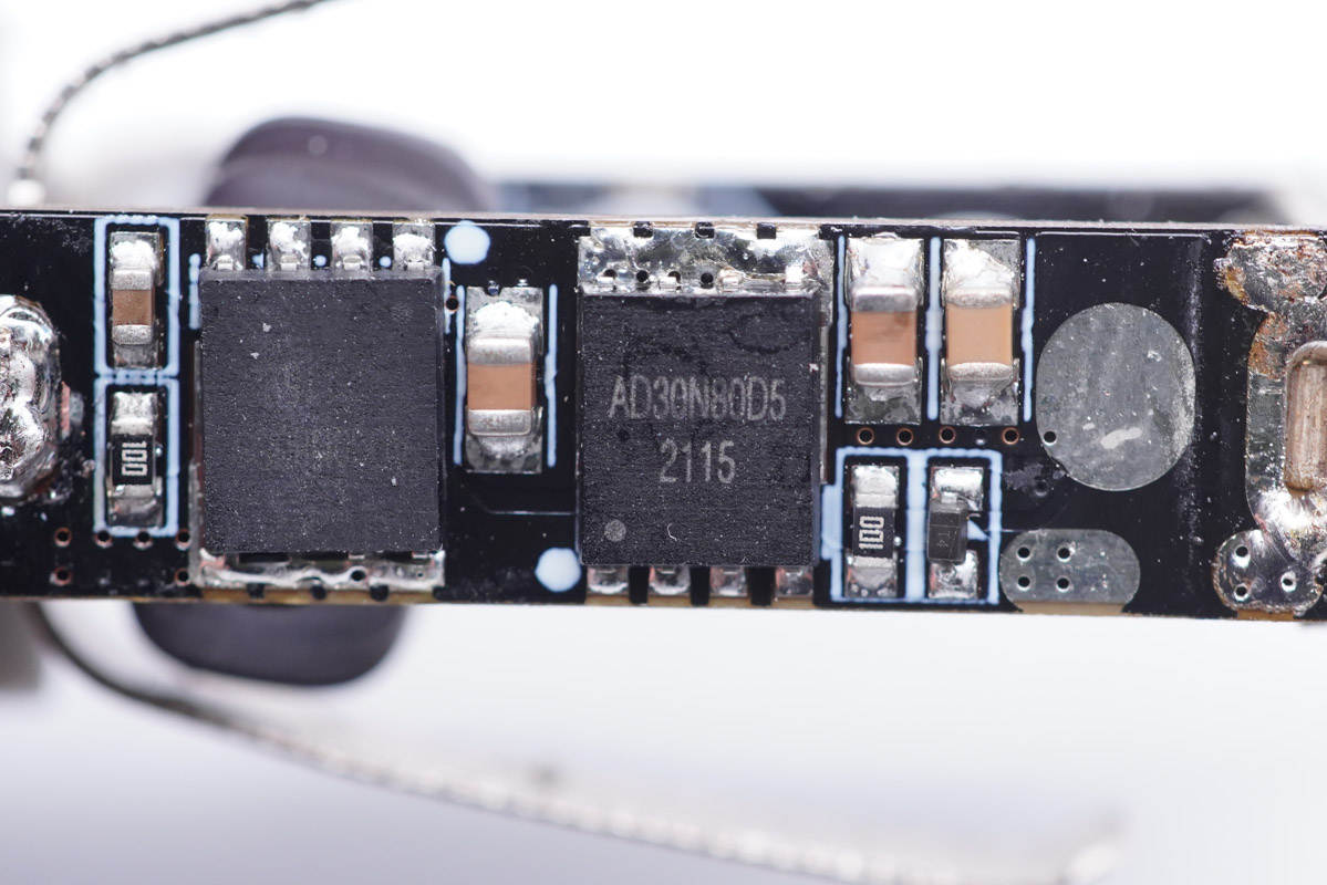 外掛四顆MOS管組成H橋,由PL5501驅動。其中一顆是砹德曼AD30N80D5,耐壓30V,導阻2.1mΩ,HSOP8封裝。左側一顆絲印不清。