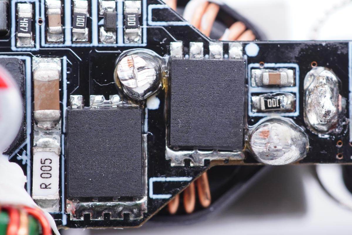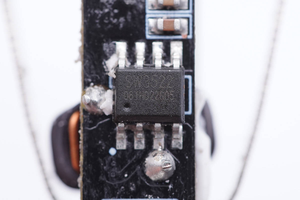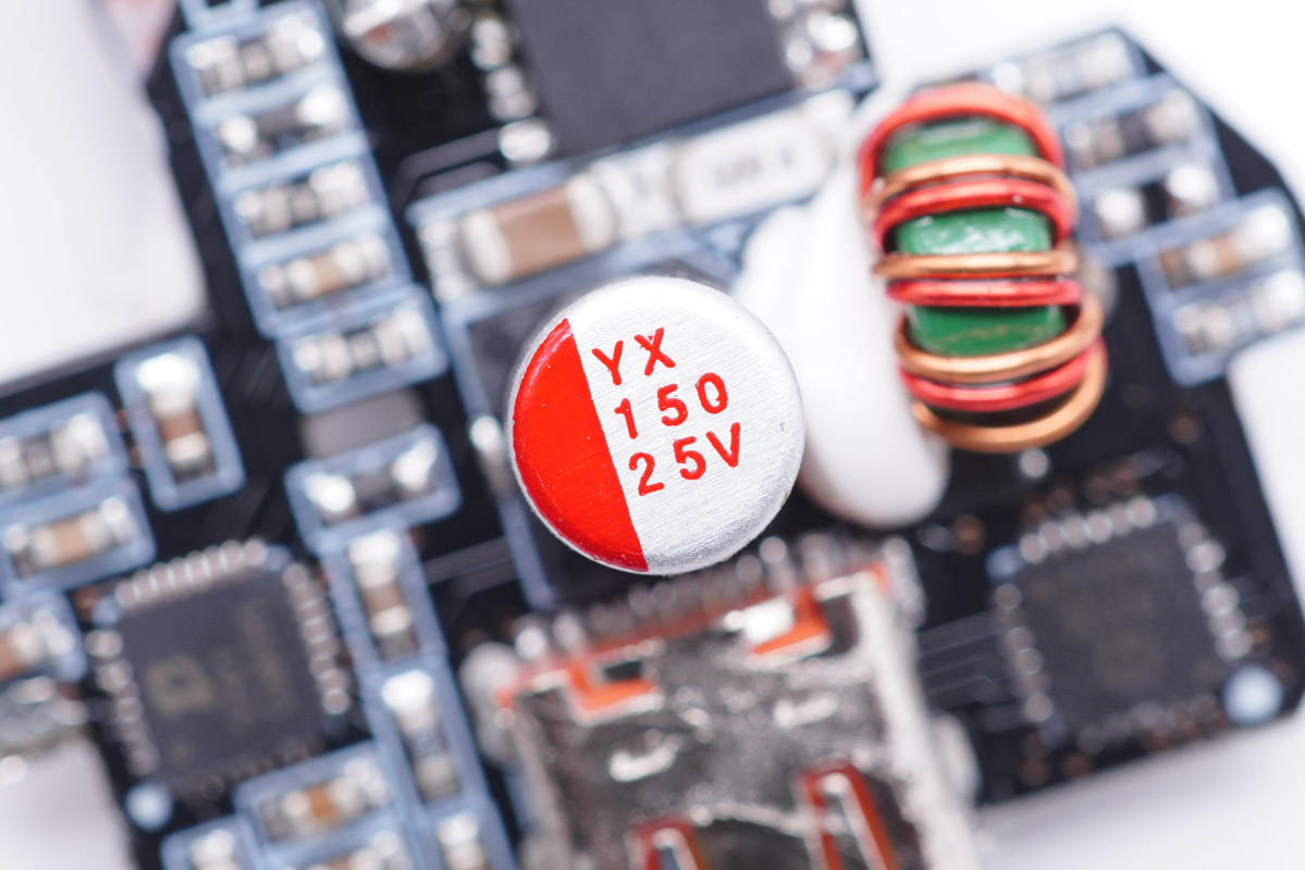 輸入濾波固態電容來自福建云星電子有限公司,規格為35V 100μF。“YX”牌固態電容專門針對USB PD快充設計,在105℃的工作環境下仍能保證2000小時的壽命,同時兼具耐高溫、耐大紋波、低ESR等特性。
