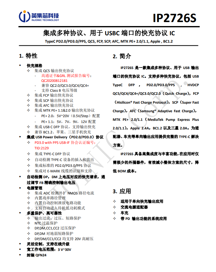 IP2726S是一顆集成多種協議、用于USB輸出端口的快充IC,支持Type-C DFP、PD2.0/3.0、PPS、QC5、QC4/4+、QC2.0/3.0、FCP、AFC、SCP、MTK PE+、Apple2.4A、BC1.2以及三星2A等協議。具有高集成度和豐富的功能,在應用時僅需極少的外圍器件,有效減小整體方案的尺寸,降低BOM成本。