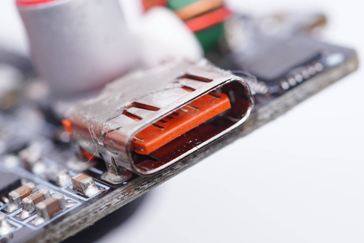 USB-C2母座特寫,焊接在垂直小板上,并包裹絕緣膠帶。