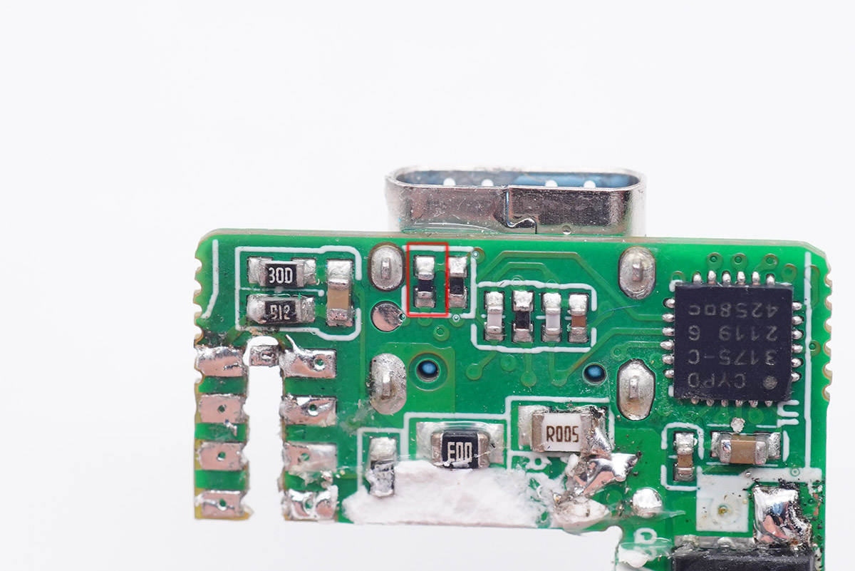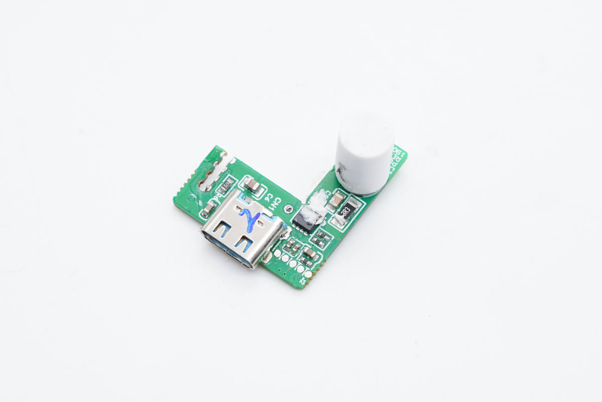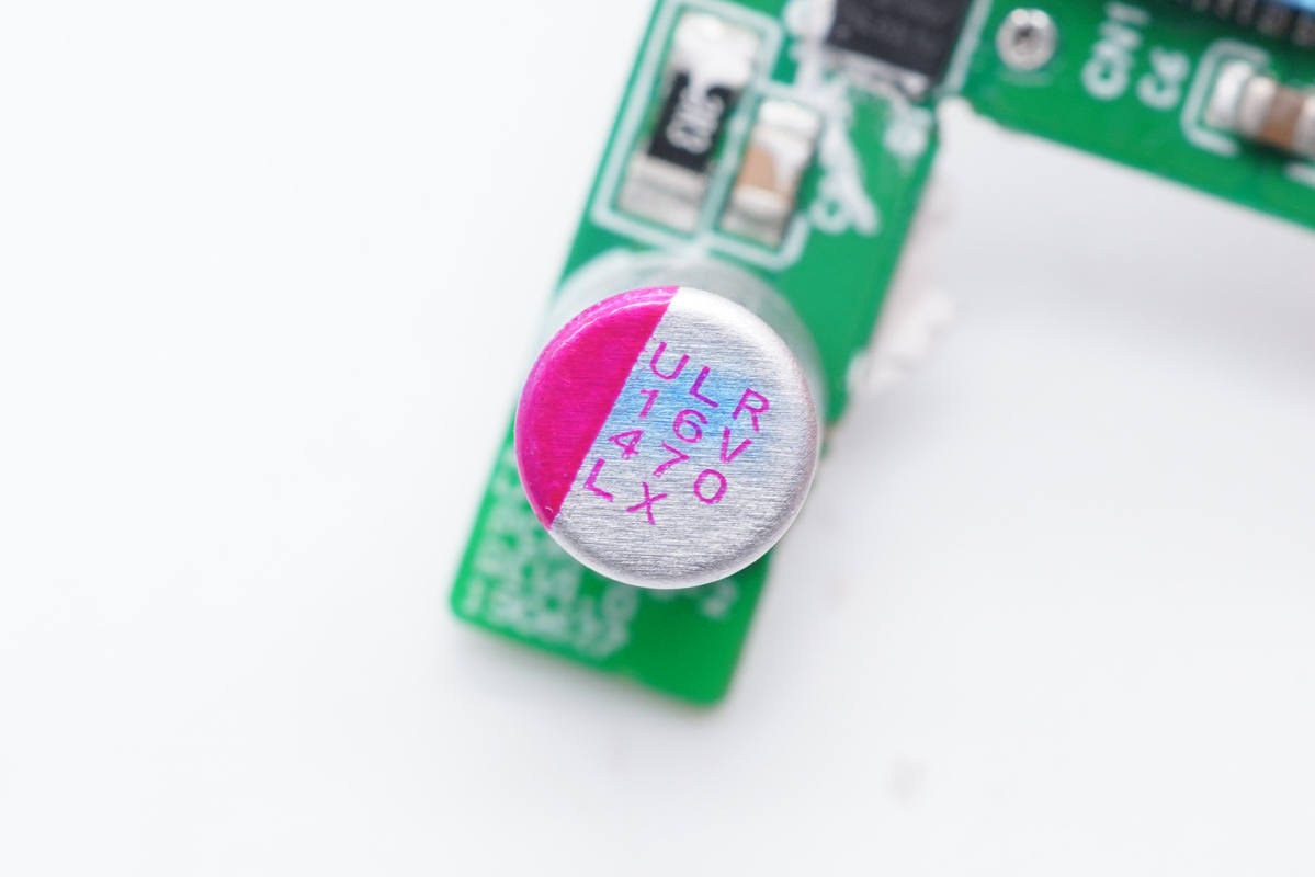 板子正面設有濾波固態電容和輸出VBUS開關管,電容套有膠套絕緣。