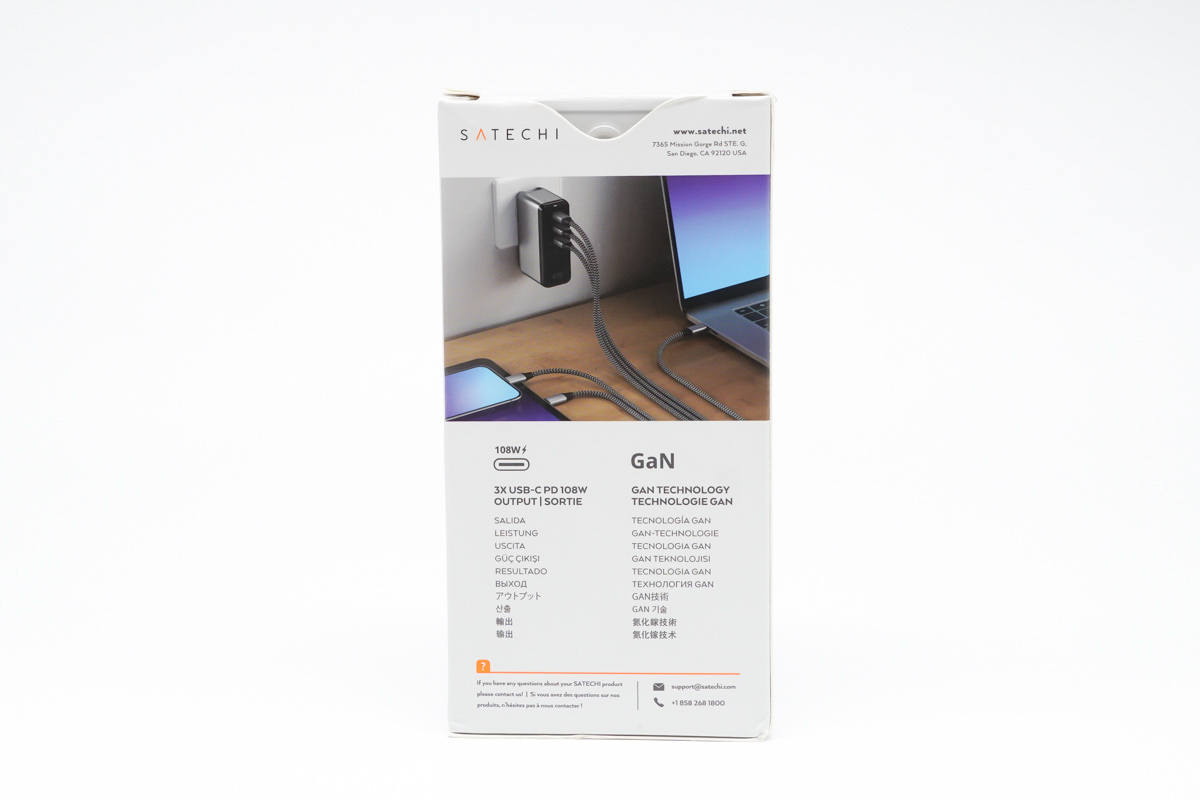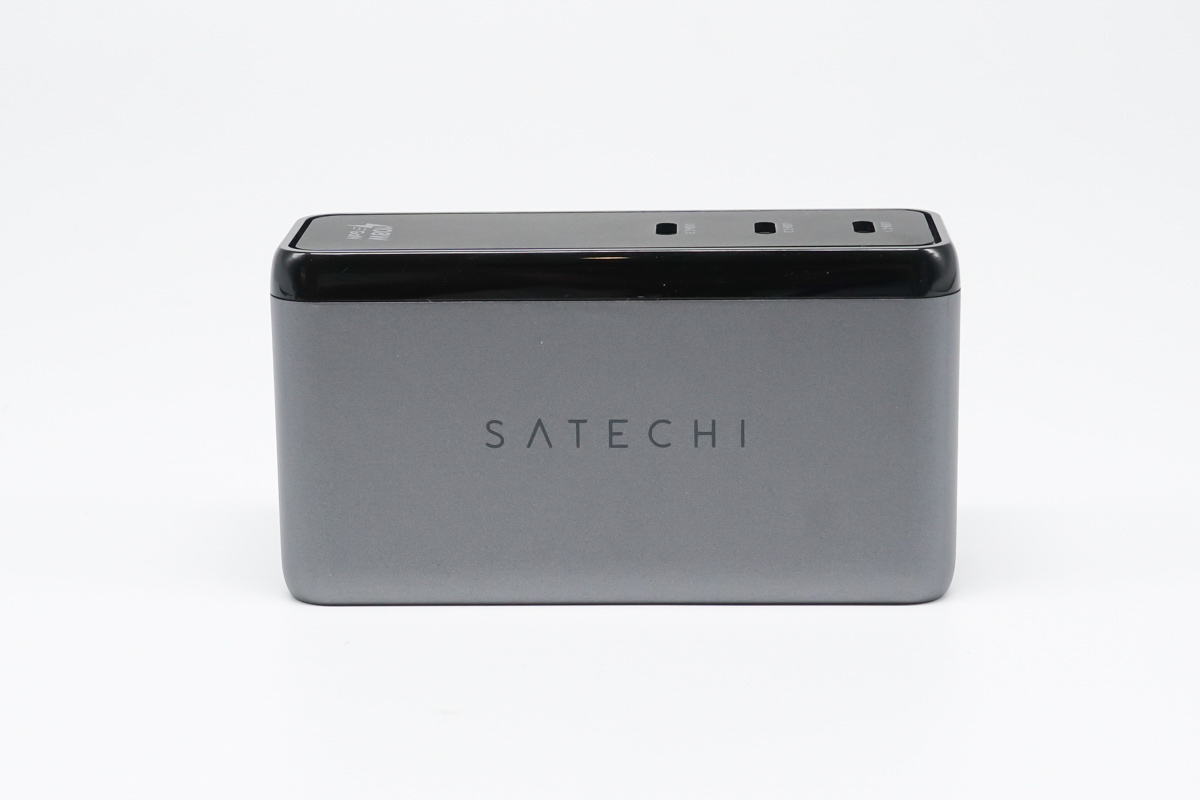 SATECHI 108W氮化鎵充電器采用長條狀的設計風格,外觀以灰色為主,黑色為輔,正面印著SATECHI的品牌Logo。