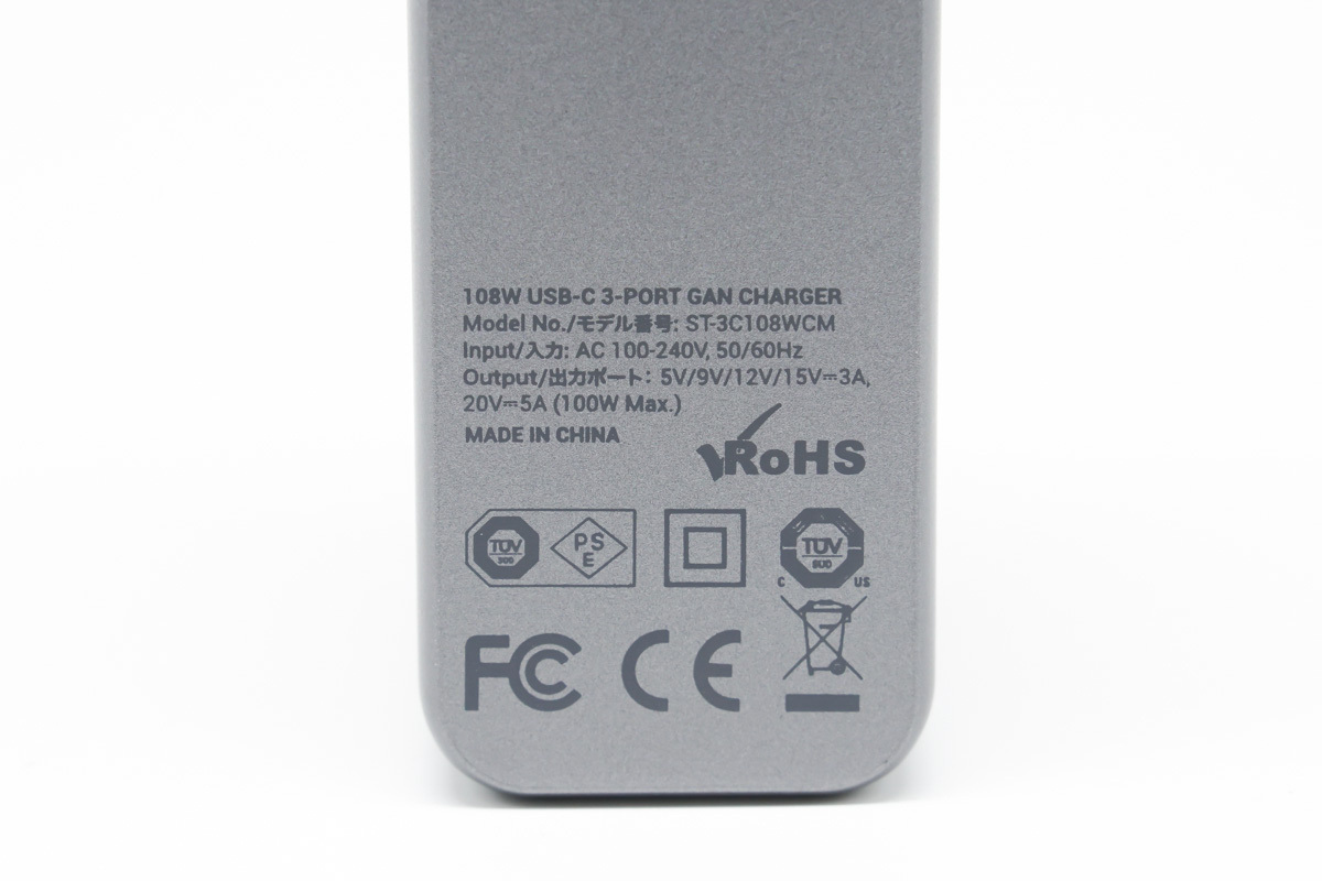SATECHI 108W氮化鎵充電器的具體型號為ST-3C108WCM,支持100-240V寬電壓輸入,中國制造。