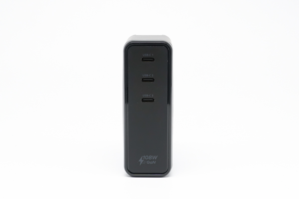 接口配置上采用3C配置,C1、C2、C3依次排列,底部的108W以及GaN的標識也說明了充電器的性能表現。
