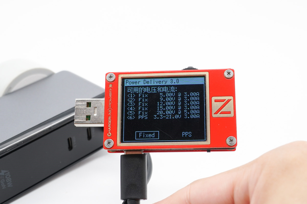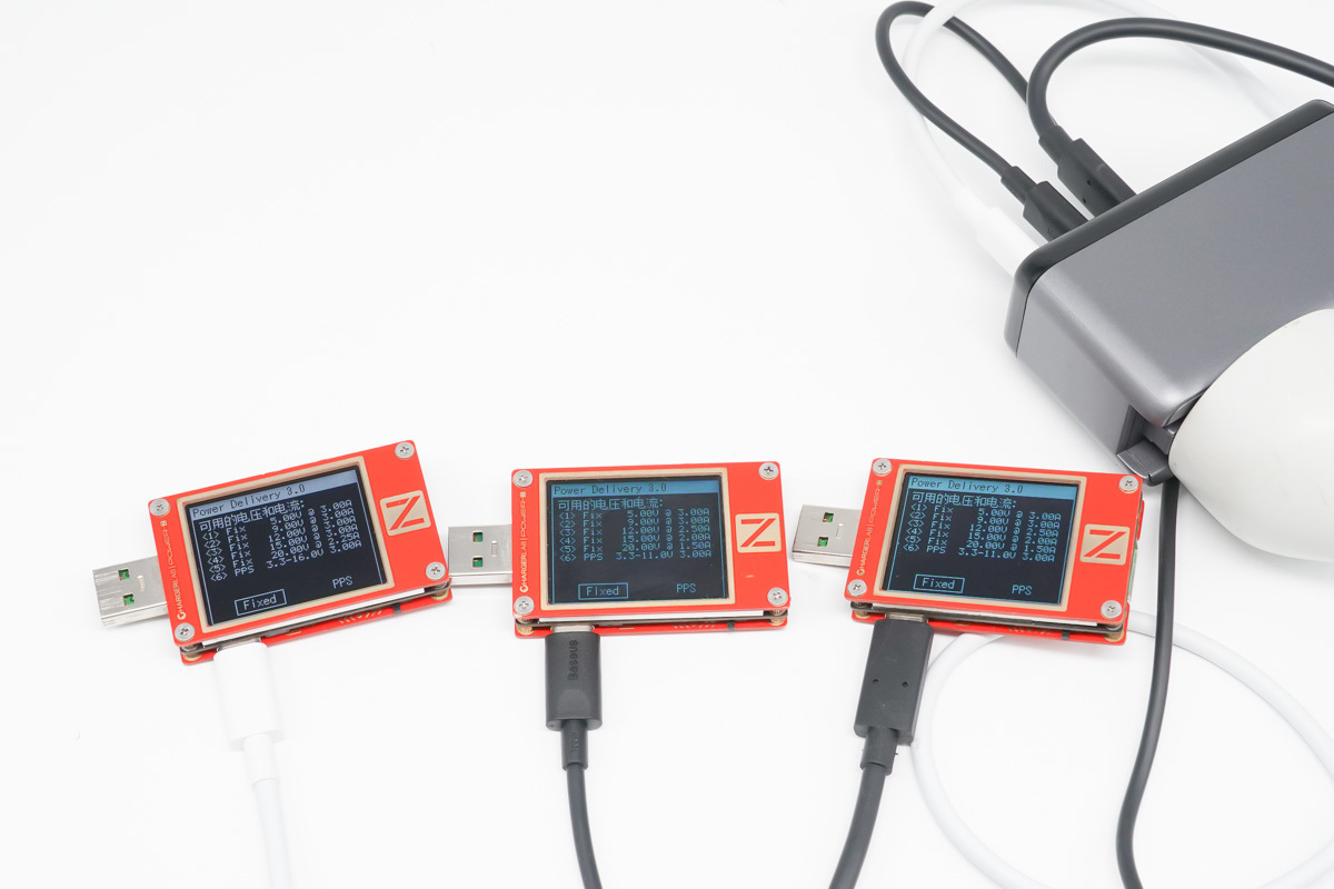 PDO報文方面,實測3個接口在獨立使用時均支持5-15V3A、20V5A五個固定電壓檔位,以及3.3-21V 3A一組PPS檔位。