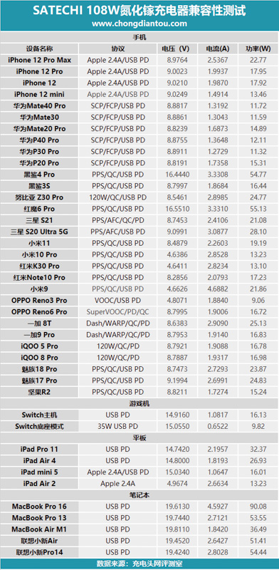 將所有的測試數據匯總,此次一共測試了手機、平板、游戲機以及筆記本四大類,整體來看均可以握手快充,兼容性不錯。