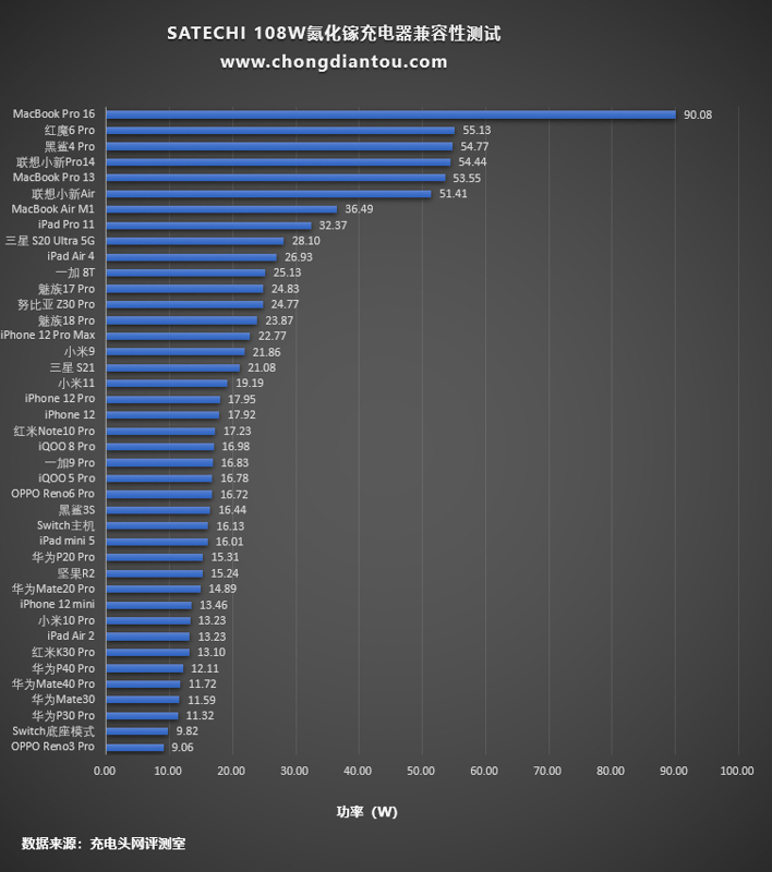 從柱狀圖上看MacBook Pro 16的功率自然最高,已經接近百瓦級別,紅魔6 Pro和黑鯊4 Pro的功率緊隨其后,剩下的柱狀圖走向整體較為平緩。