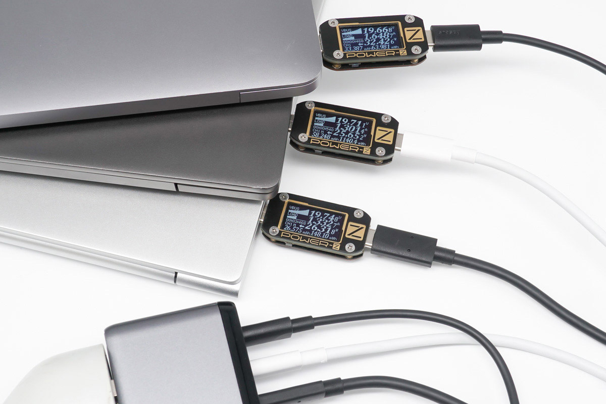 最后同時使用3個USB-C接口為3臺筆記本電腦充電,接口會根據輸出設備智能調節輸出功率,三口最大總輸出為108W。