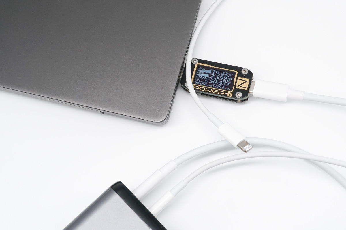 使用USB-C1為筆記本充電,同時使用USB-C2連接C to Lightning快充線空載,此時充電器會默認蘋果快充線有輸出執行雙口同時輸出功率策略,這一情況在很多多口氮化鎵充電器中都有見到過。