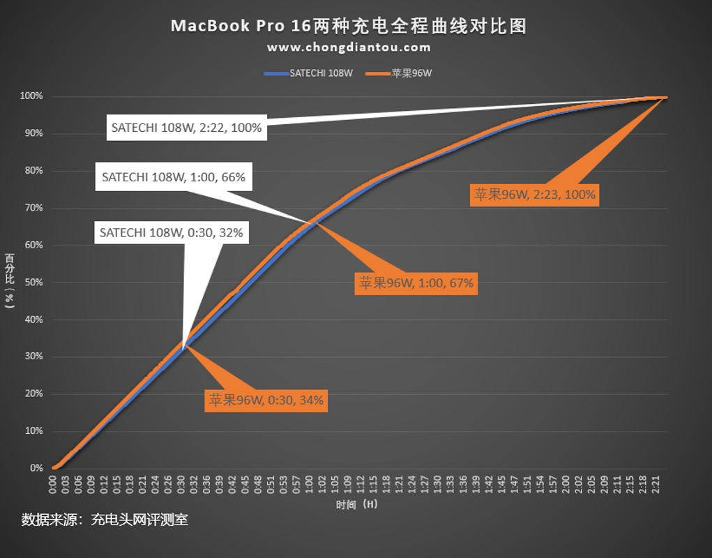 將SATECHI 108W氮化鎵充電器與蘋果96W PD充電器為MacBook Pro 16充電全程曲線圖匯總,可以看出兩條曲線幾乎重合。使用SATECHI 108W氮化鎵充電器可以獲得和原裝PD充電器一樣的快充體驗。